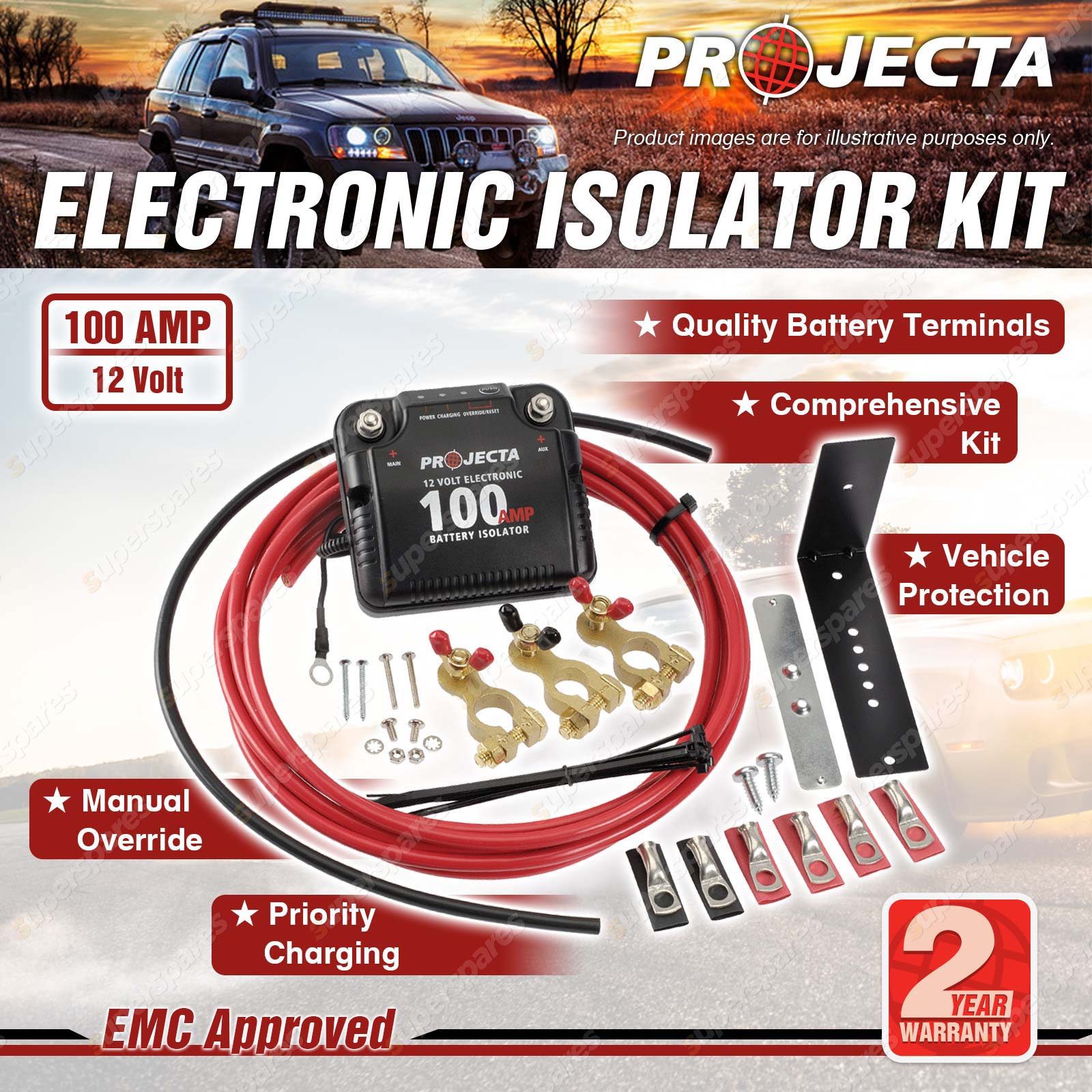 Projecta Dual Battery Isolator Kit 12 Volt 4WD Caravan Dual Battery Kit - PART NO DBC100K A fully automatic dual battery kit suitable for any mid-sized vehicle with an auxiliary battery. Kit comprises: Electronic isolator (100A: P/No. DBC100),lugs,terminals,heat shrink & cable ties,4m main cable & 60cm aux earth cable (6 B&S) bracket,auxiliary battery terminals (2 x pos,1 x neg) FEATURES Priority charging Comprehensive kit Manual override Quality battery terminals Vehicle protection | ||||||||||||||||||||||||||||||||||||||||||||||||||||||||