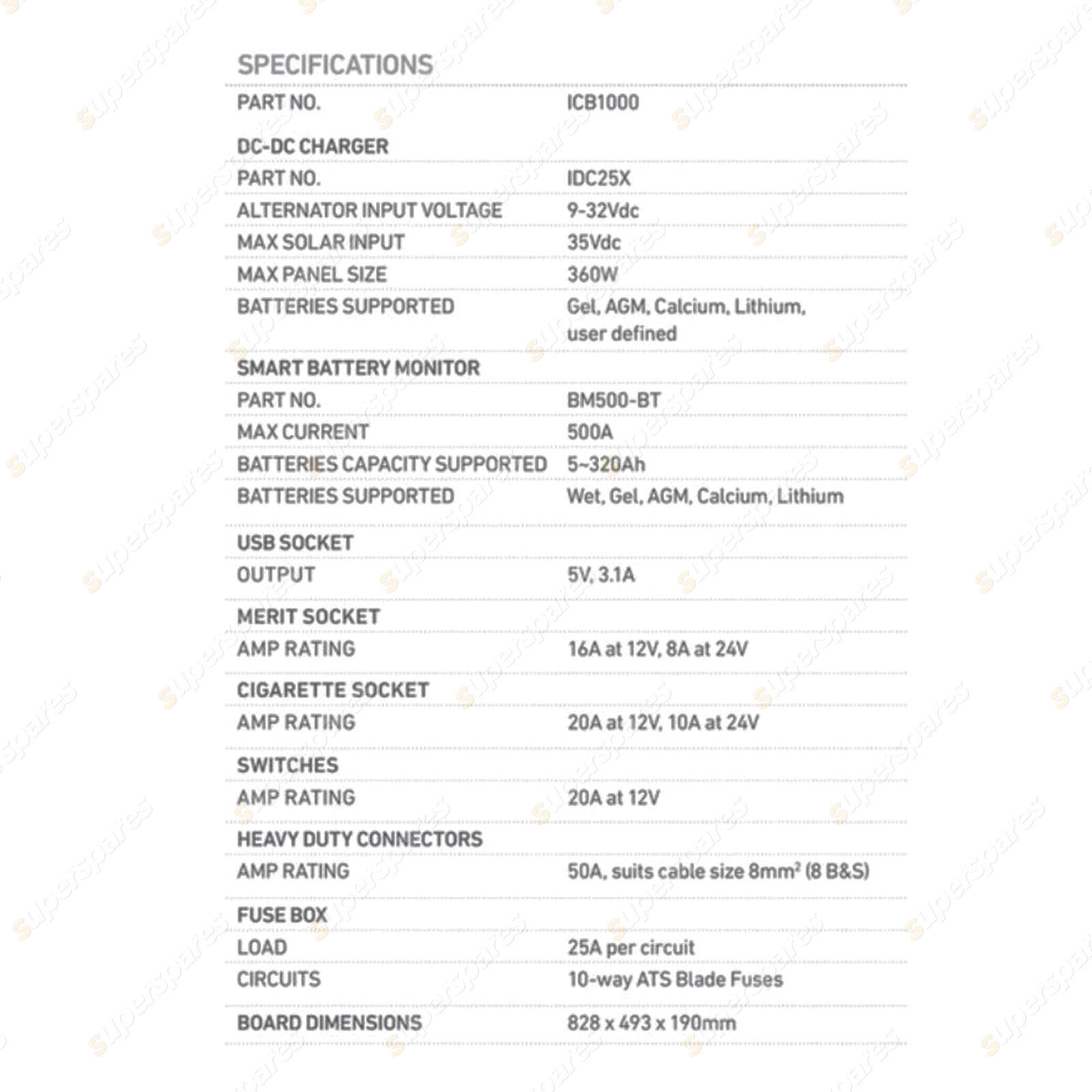 Take control of your off-grid power with the Projecta ICB1000 ¨C a premium 12V DC power management board featuring advanced Intelli-Series components. This pre-wired, all-in-one solution includes a 25A multi-chemistry DC to DC dual battery charger and a powerful 1000W pure sine wave inverter, making it perfect for ute canopies, caravans, and 4x4 touring setups. Designed for fast, clean installations, the ICB1000 ensures professional results with minimal effort, supporting lithium and AGM battery systems for maximum flexibility.