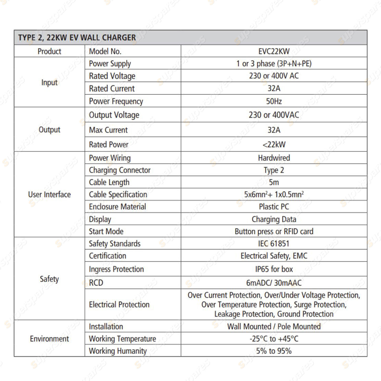 Contents : Projecta Type 2 Electric Vehicle Wall Charger 22KW Provides AC Power