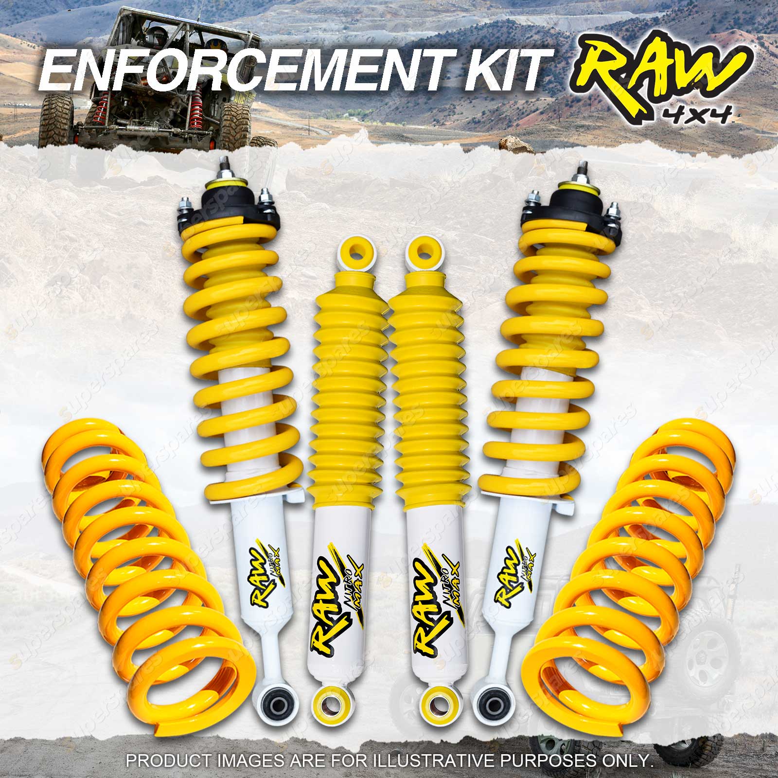 | Front | Raw 4x4 Pre-Assembled Strut Nitro Max Shocks With Coil Springs | 2 | 45mm Bore Nitrogen Gas Technology |