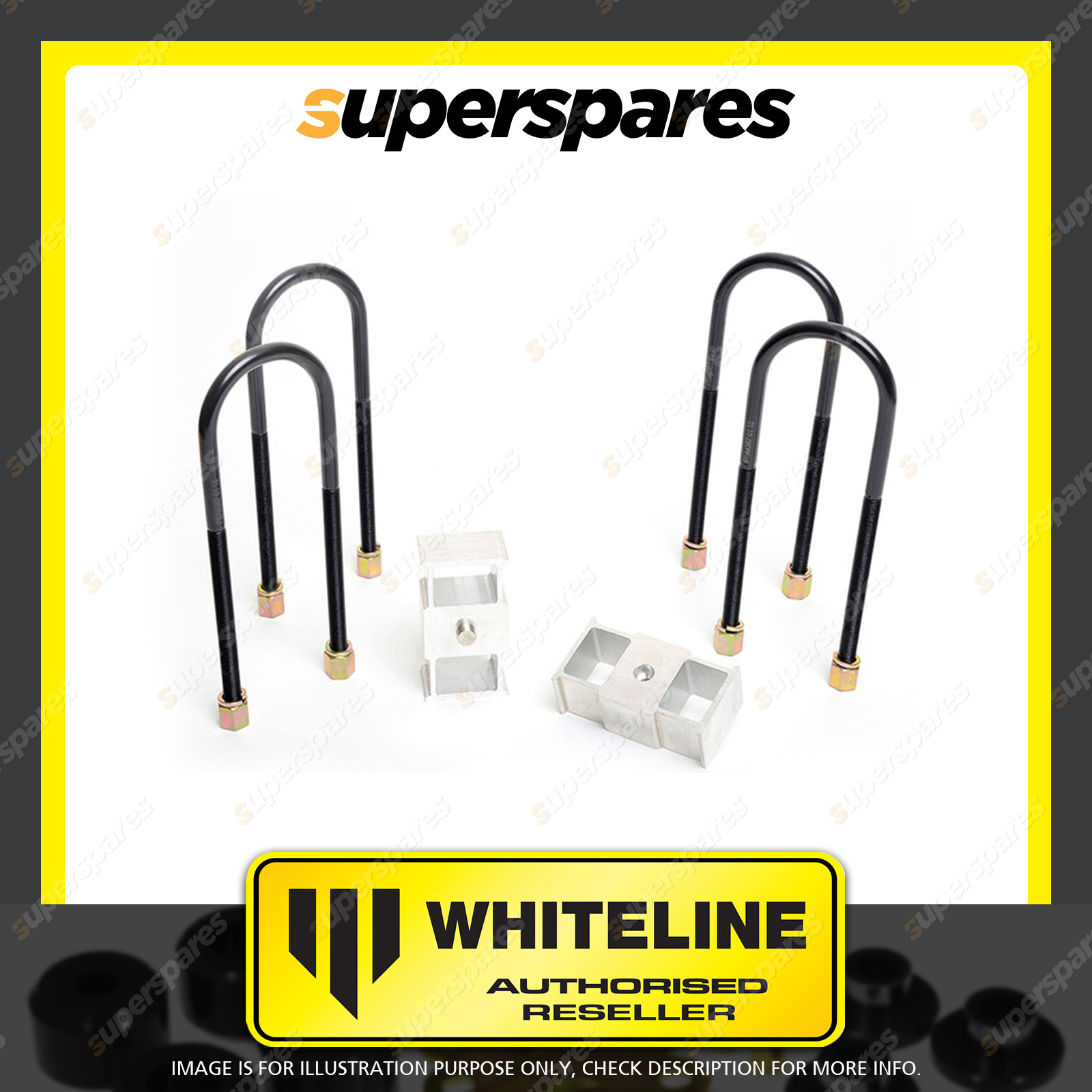 | Contents : Whiteline Rear Lowering block - kit Warranty : 3 Year / 60,000Kms Kit Contents : 2 Blocks, 4 U-Bolts, 4 Washers, 4 Nuts, Install Guide |