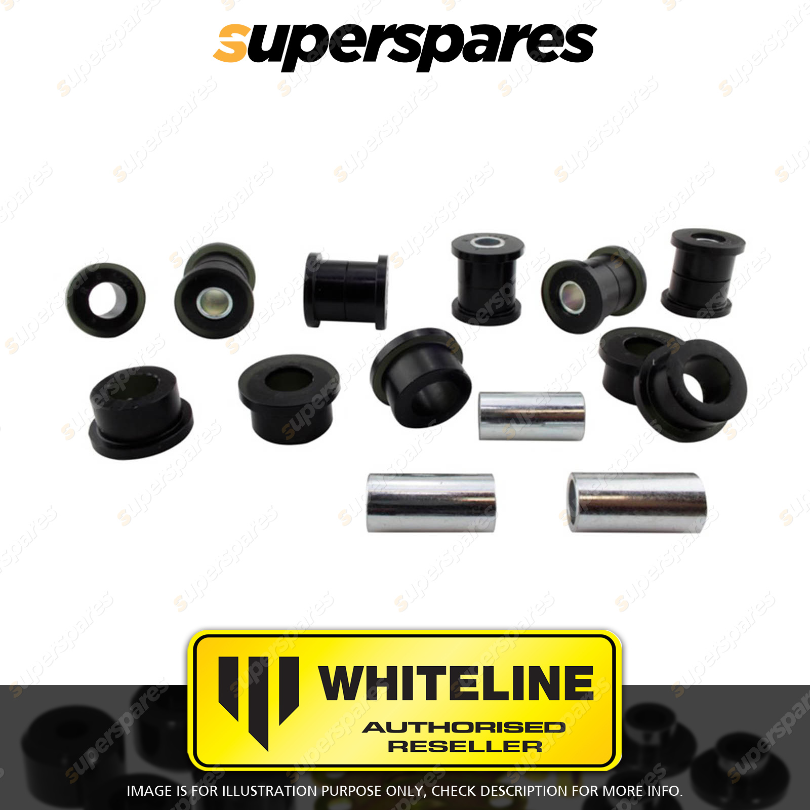 | Contents : Whiteline Rear Control arm - inner and outer bushing Warranty : 3 Year / 60,000Kms Kit Contents : 16 Bushings, 8 Tubes, Grease |