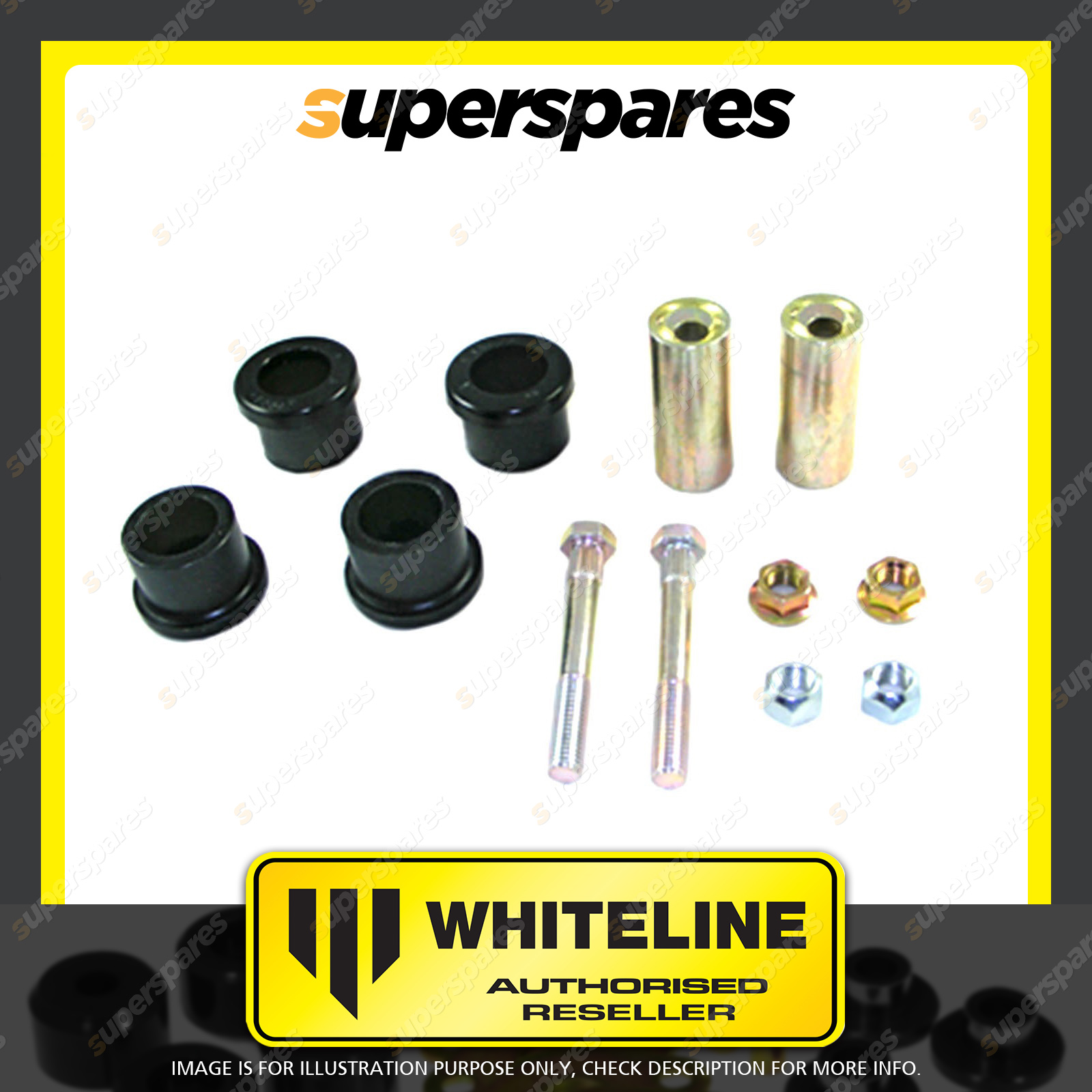Contents : Whiteline Rear Control arm - inner bushing Warranty : 3 Year / 60,000Kms Kit Contents : 4 Bushings, 2 Tubes, 2 Bolts, 4 Nuts, Install Guide, Grease | Kit Specifications : Bush Qty : 4 |