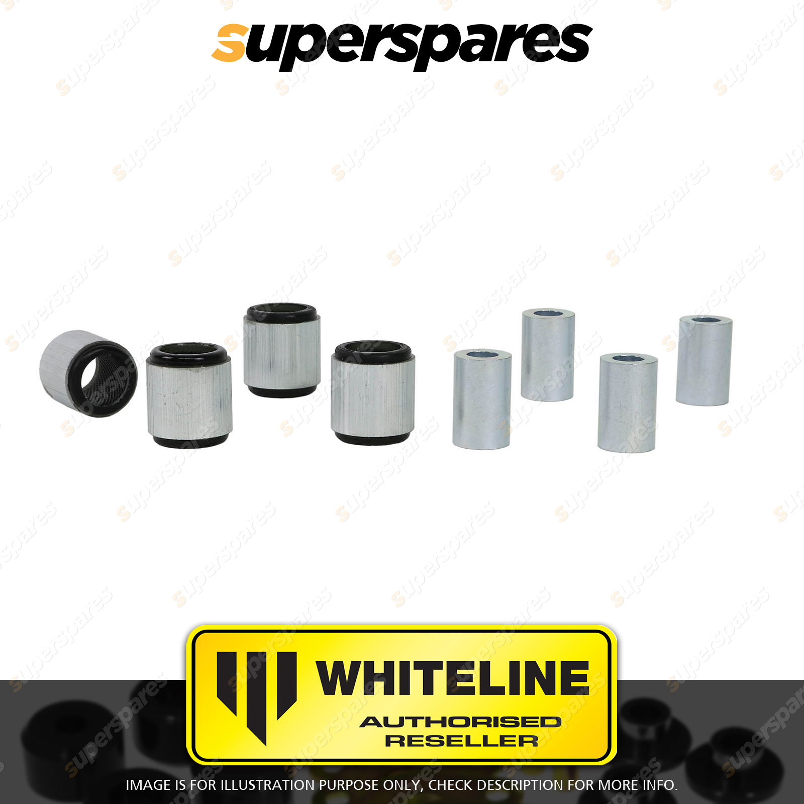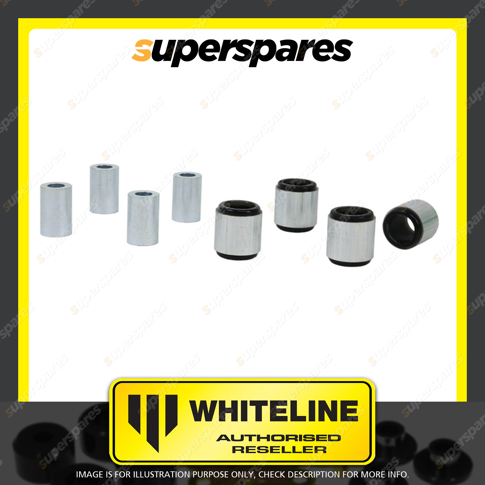 | Contents : Whiteline Rear Control arm - lower Front inner and outer bushing Warranty : 3 Year / 60,000Kms Kit Contents : 4 Shell Bushings, 4 Tubes, Grease |