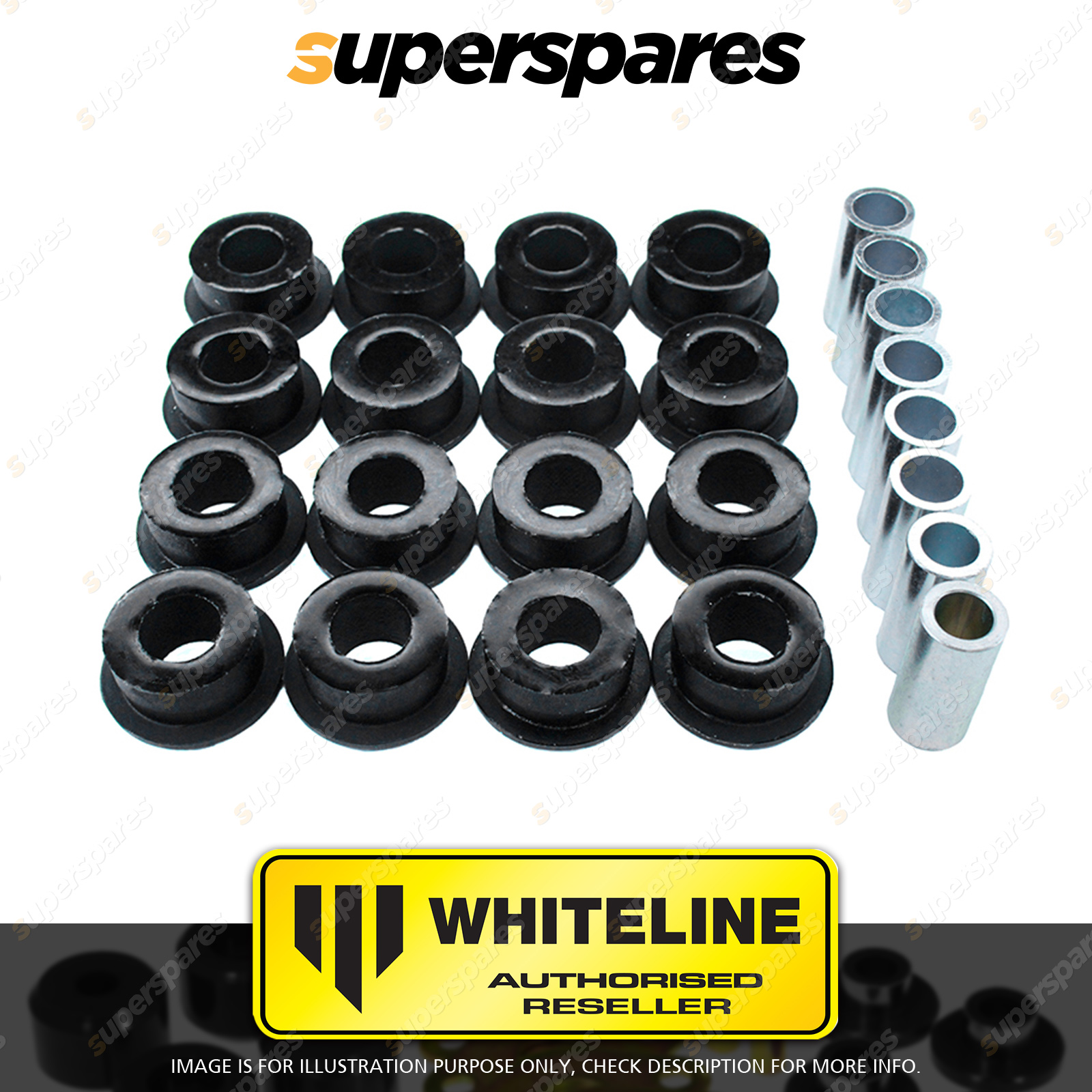 | Contents : Whiteline Rear Control arm - lower inner and outer bushing Warranty : 3 Year / 60,000Kms Kit Contents : 16 Bushings, 8 Tubes, Grease |
