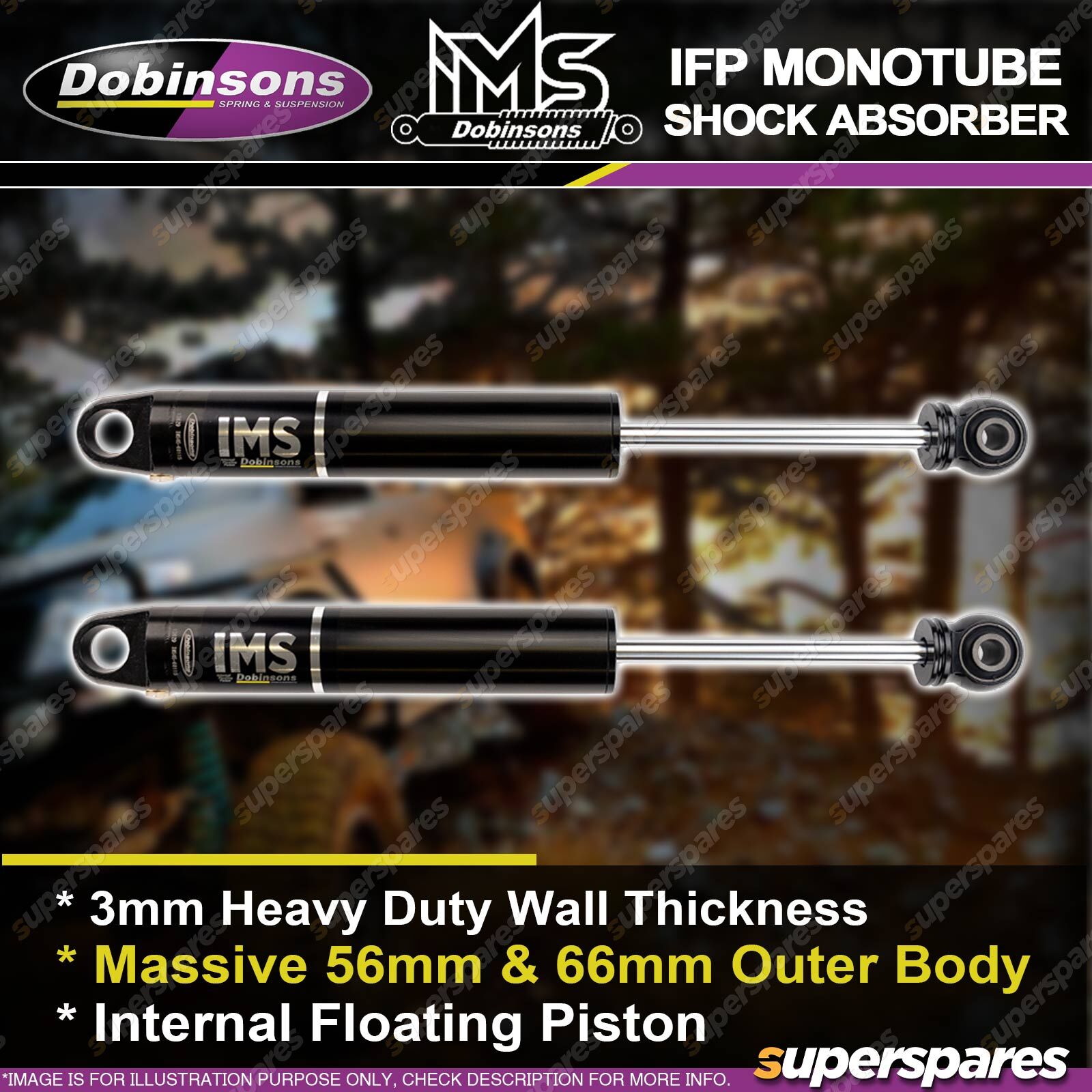Dobinsons IMS monotube shock absorbers are designed for next level performance over twin tube shocks in those hot, harsh, demanding conditions. By utilising the monotube design, Dobinsons IMS shock absorbers are able to resist fade far longer on corrugated roads, long or hard working 4WD trips, towing or racing conditions. Feature: Zero shock fade in all terrains Direct, bolt-on replacement for easy fitment Corrosion resistant (EDP Surface Protection) Heavy duty single piece lower leg Enormous oil capacity Heavy Duty 3 Stage FKM HNBR Sealing System for the ultimate in offroad handling Race inspired Hi-Flow CNC 6061 Billet Alloy Piston for the ultimate in offroad handling | ![]() |