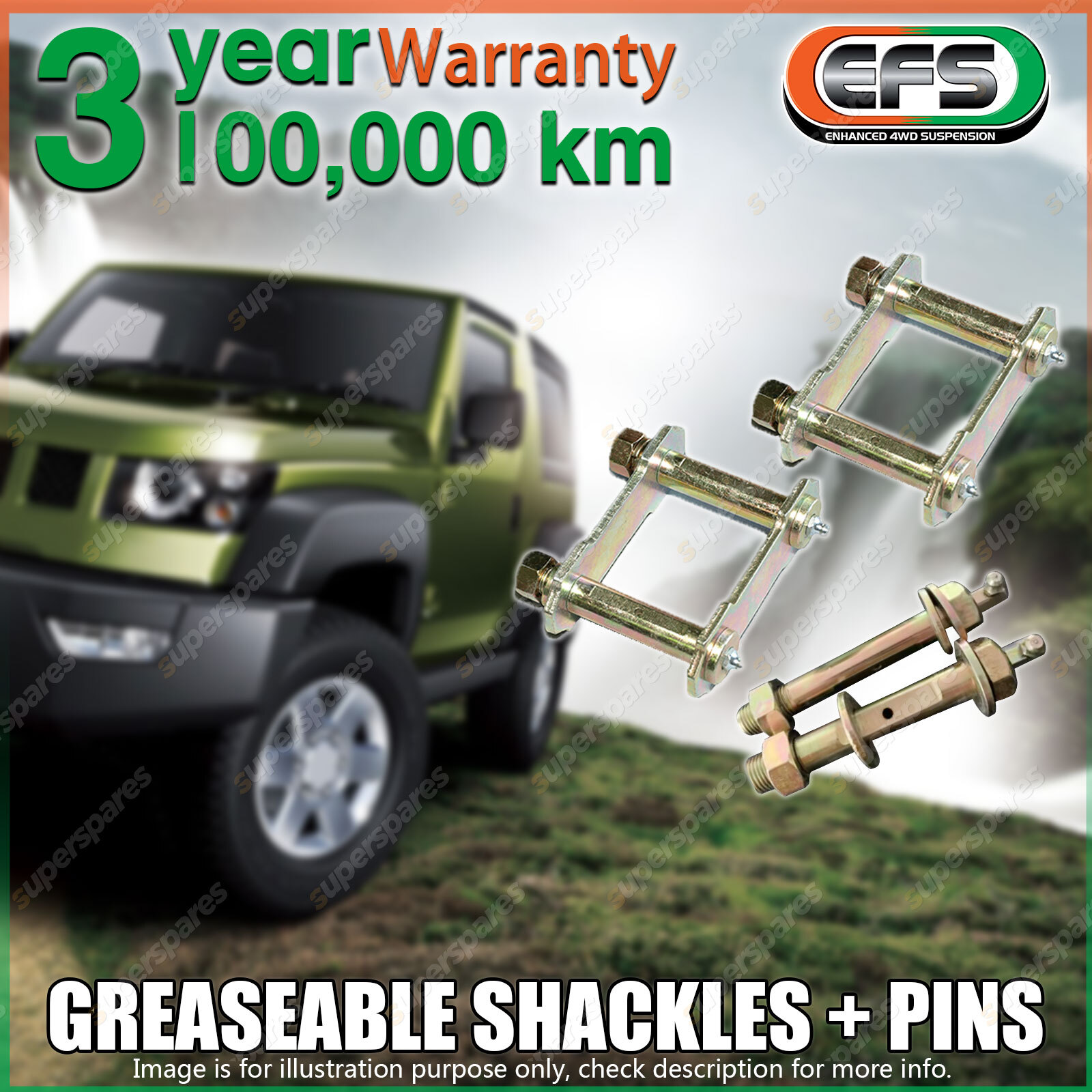 Specifications: EFS GREASEABLE Shackles + Pins ----EFS quality Shackles, Pins are an important addition to any vehicle. Engineering to be stronger than the original equipment the Pins & Shackles are made from medium & high grade carbon steels, then case hardened & gold cadmium plated for increased strength & corrosion protection.