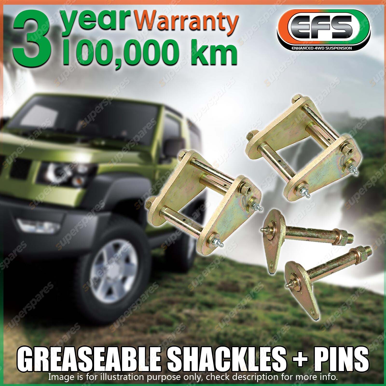 | Specifications: EFS GREASEABLE Shackles + Pins ----EFS quality Shackles, Pins are an important addition to any vehicle. Engineering to be stronger than the original equipment the Pins & Shackles are made from medium & high grade carbon steels, then case hardened & gold cadmium plated for increased strength & corrosion protection.