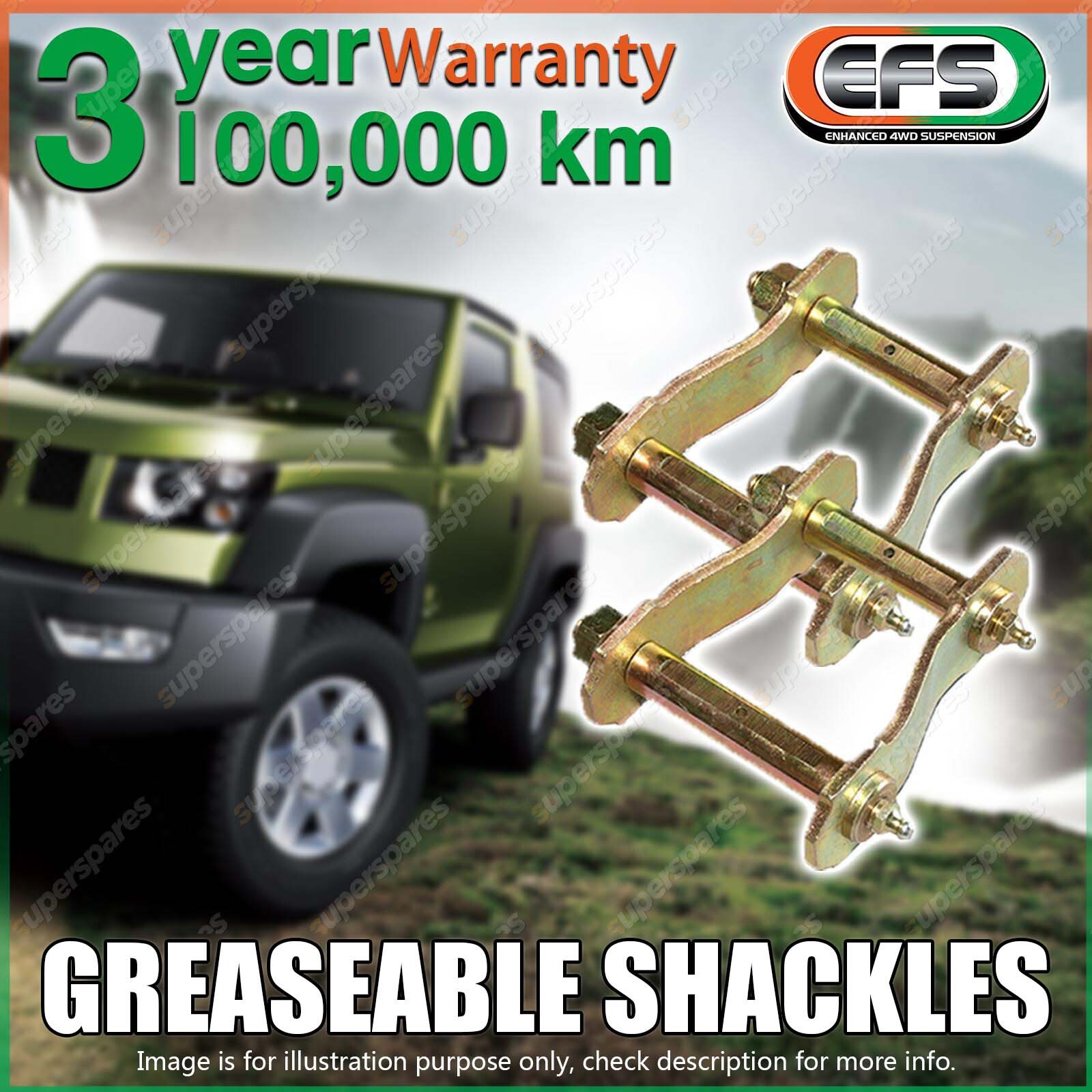 | Specifications: EFS GREASEABLE SHACKLES----EFS quality shackles are an important addition to any vehicle. Engineering to be stronger than the original equipment the Pins & Shackles are made from medium & high grade carbon steels, then case hardened & gold cadmium plated for increased strength & corrosion protection.