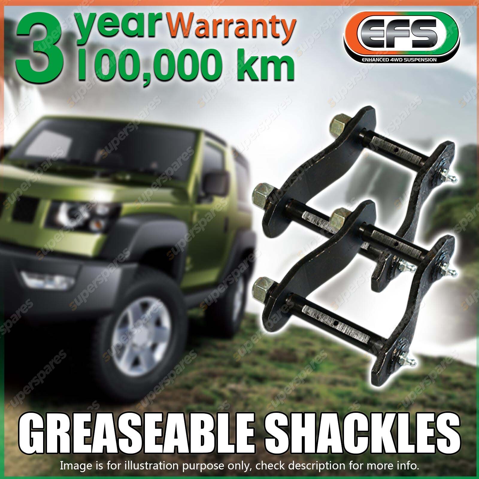 | Specifications: EFS GREASEABLE SHACKLES----EFS quality shackles are an important addition to any vehicle. Engineering to be stronger than the original equipment the Pins & Shackles are made from medium & high grade carbon steels, then case hardened & gold cadmium plated for increased strength & corrosion protection.