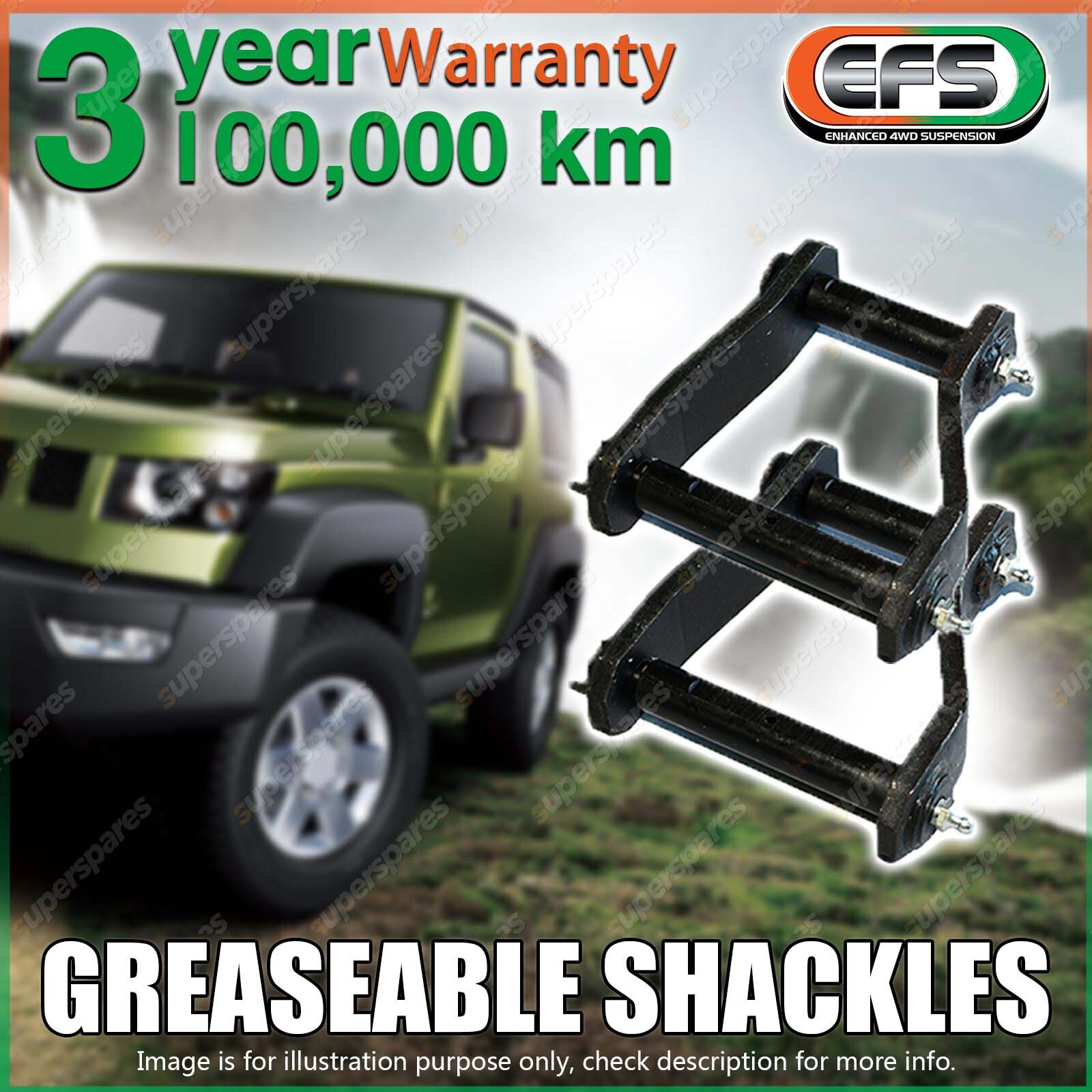 | Specifications: EFS GREASEABLE SHACKLES----EFS quality shackles are an important addition to any vehicle. Engineering to be stronger than the original equipment the Pins & Shackles are made from medium & high grade carbon steels, then case hardened & gold cadmium plated for increased strength & corrosion protection.