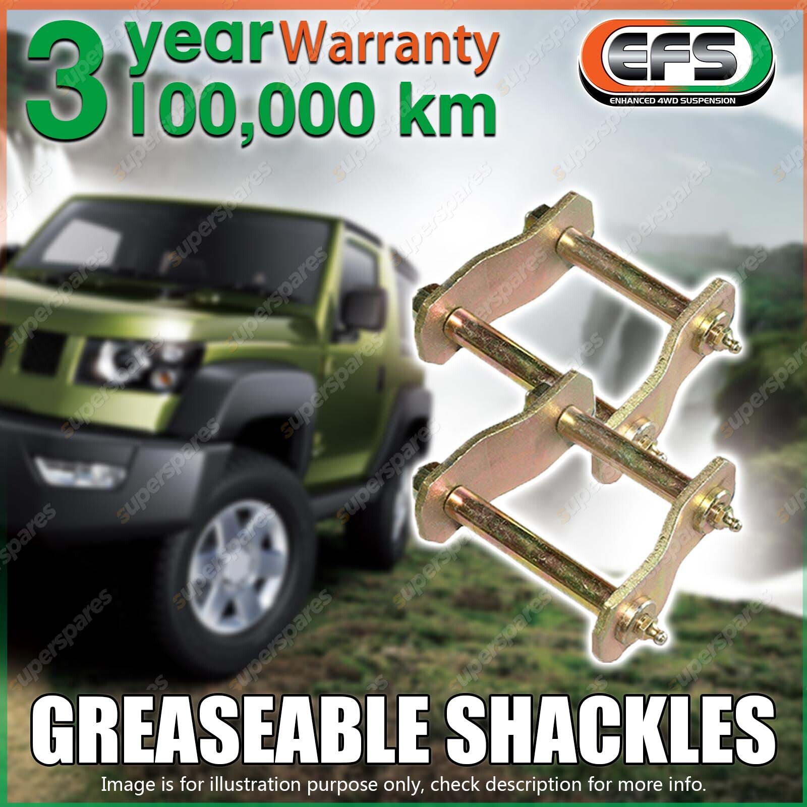 | Specifications: EFS GREASEABLE SHACKLES----EFS quality shackles are an important addition to any vehicle. Engineering to be stronger than the original equipment the Pins & Shackles are made from medium & high grade carbon steels, then case hardened & gold cadmium plated for increased strength & corrosion protection.