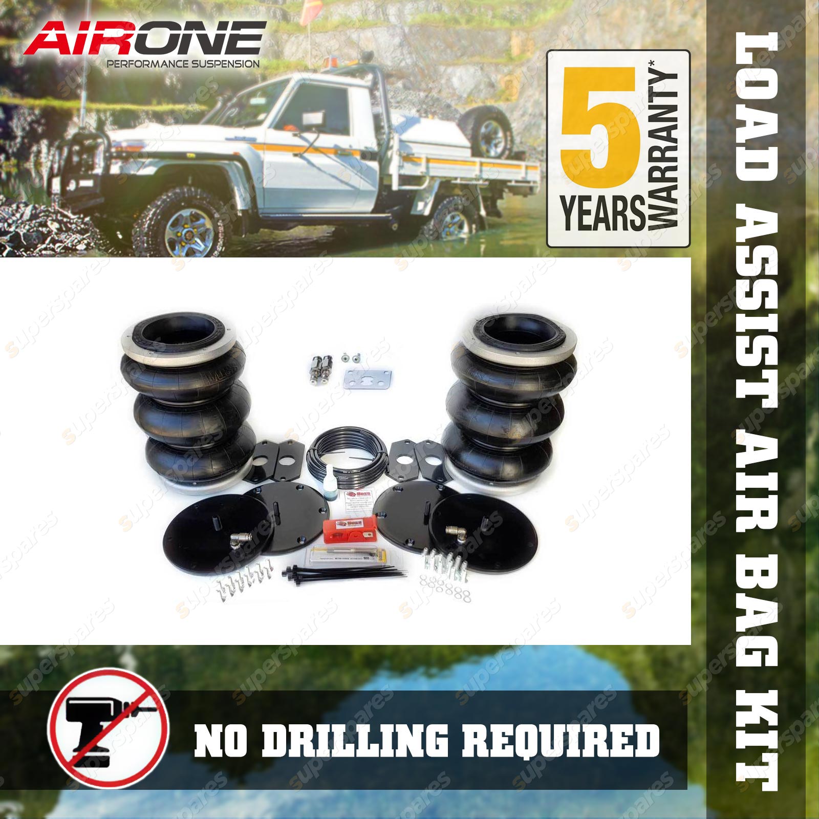 The Airone Extreme series airbags are rated at 2600lb or 1186kg per side and have been government approved tested to over 750psi. Average dual cab ute will run around 15-45psi depending on load. NOTE: This kit is not suitable for a lowered vehicle due to the limited space between the chassis and axle. |
