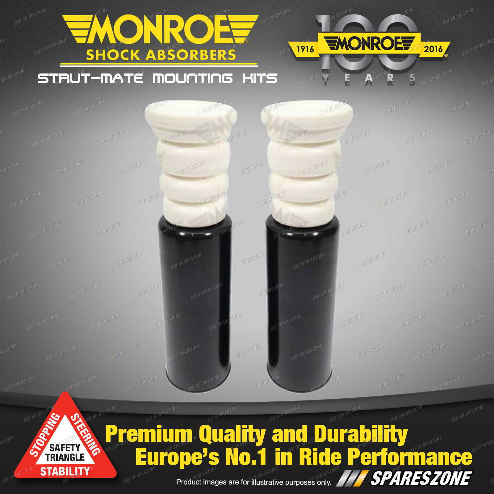 Too often a new strut or cartridge is fitted with the old original and damaged suspension travel limit bushing (compression bumper) and dust boot. The Monroe Strut Mate kit includes a high quality, soft entry urethane compression bumper, a new dust boot, retaining strap and fitting instructions. |