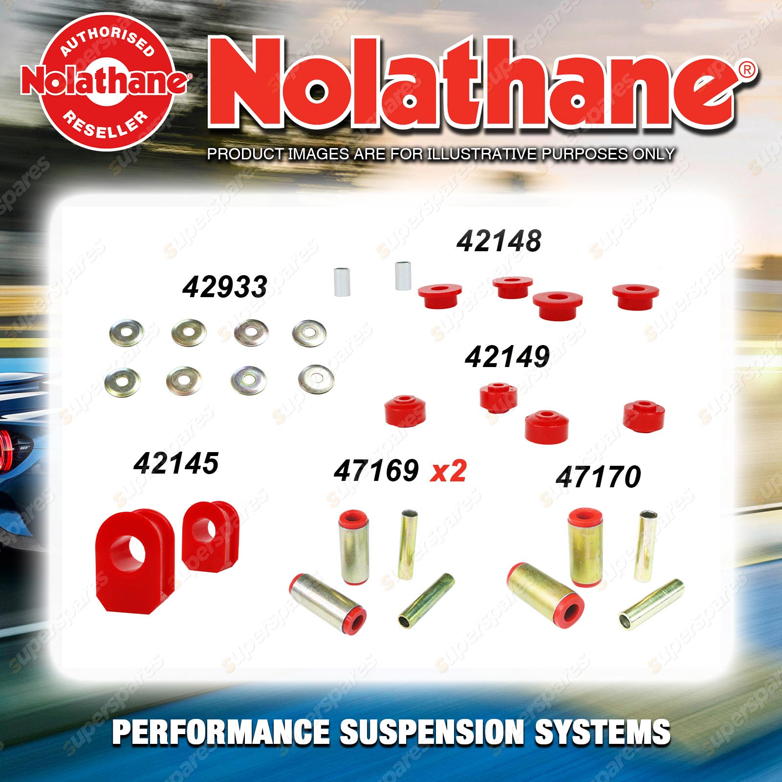 | Nolathane offers a complete range of suspension system.And Nolathane suspension bushing synchronise your suspension system for optimal safety, hangdling and performance .Whether you intend to build a Street Machine, Fast 4, go bush or simply drive to work,suspension bushes are the link between your vehicle and it's springs,struts and shock absorbers.Suspension bushes provide the movement and/or mounting points in your vehicle's suspension system. |