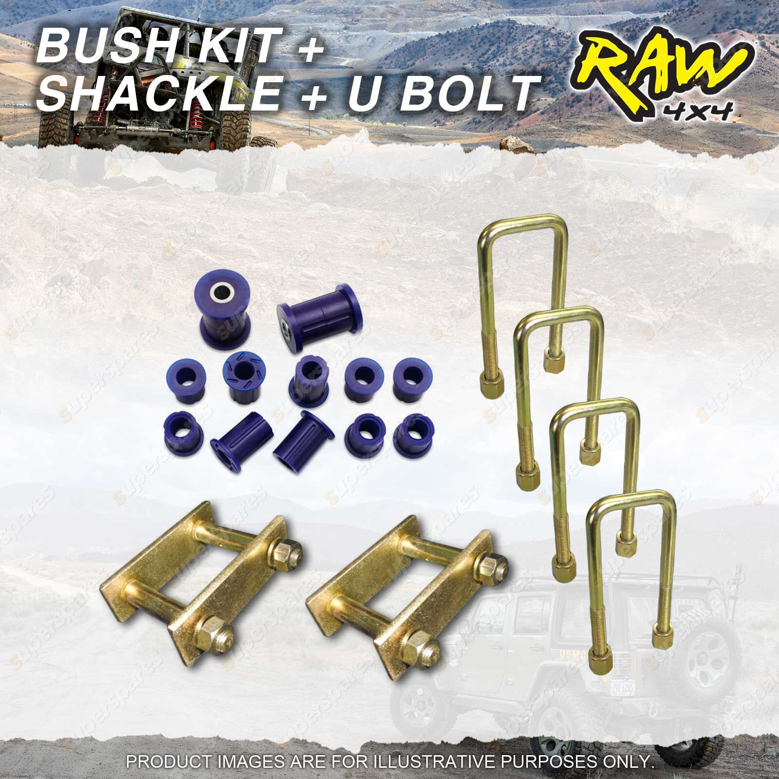 Content : Rear RAW 4x4 Bush + Shackle + U Bolt Kit