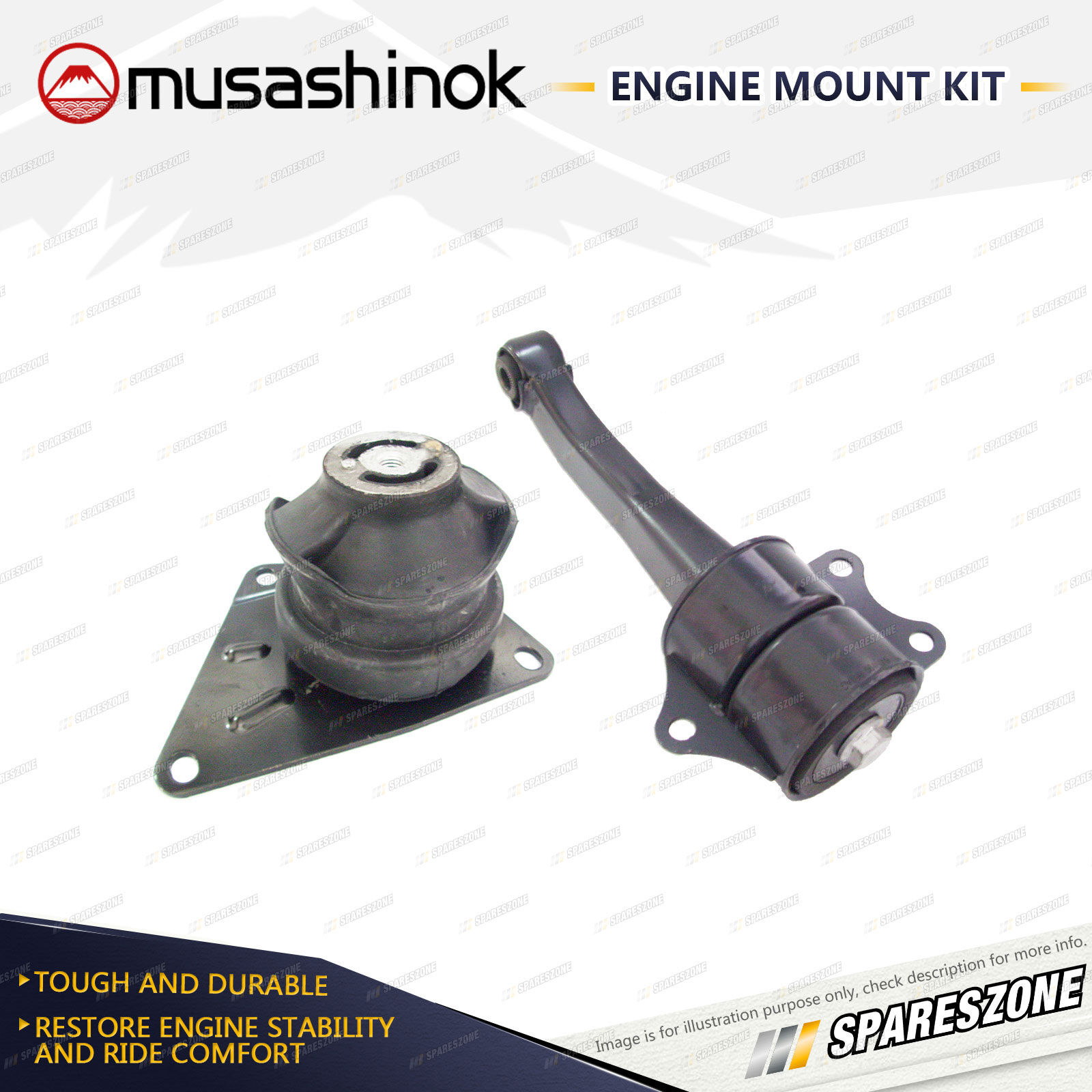 ![]() | About Engine Mounts : Musashinok engine mounts are manufactured to OE standard and very high quality, which is vital given the additional pressure on today's engine mounts.The Musashinok Engine Mount range sets new standards for quality whether manufactured in rubber or urethane.Musashinok's unique urethane design provides rubber-like smoothness and combined with urethanes durability, gives an added advantage over similar products manufactured with rubber. This makes them an ideal product for use in taxis and other commercial fleets. |