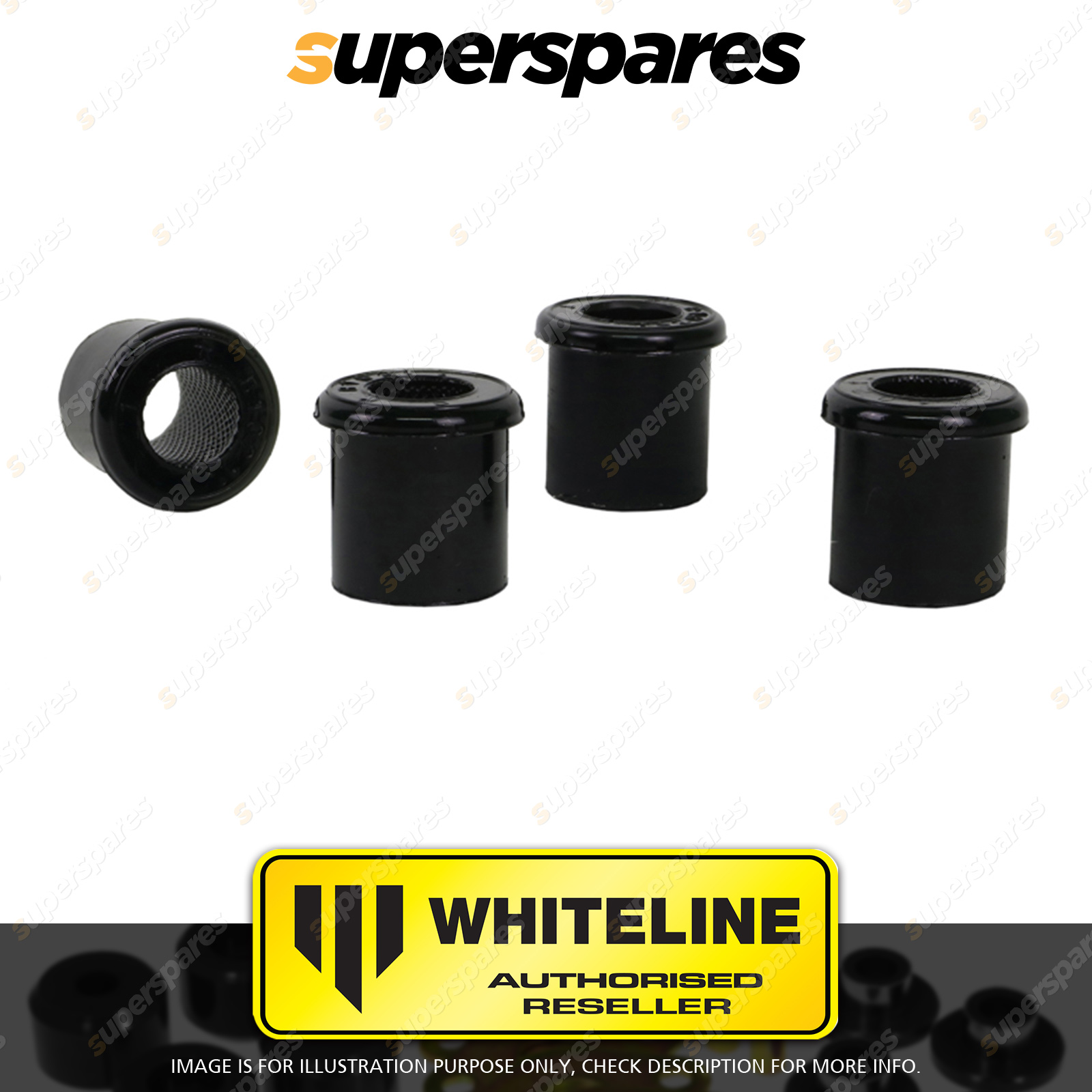 | Contents : Whiteline Rear Spring - eye Rear and shackle bushing Warranty : 3 Year / 60,000Kms Kit Contents : 4 Bushings, Grease |