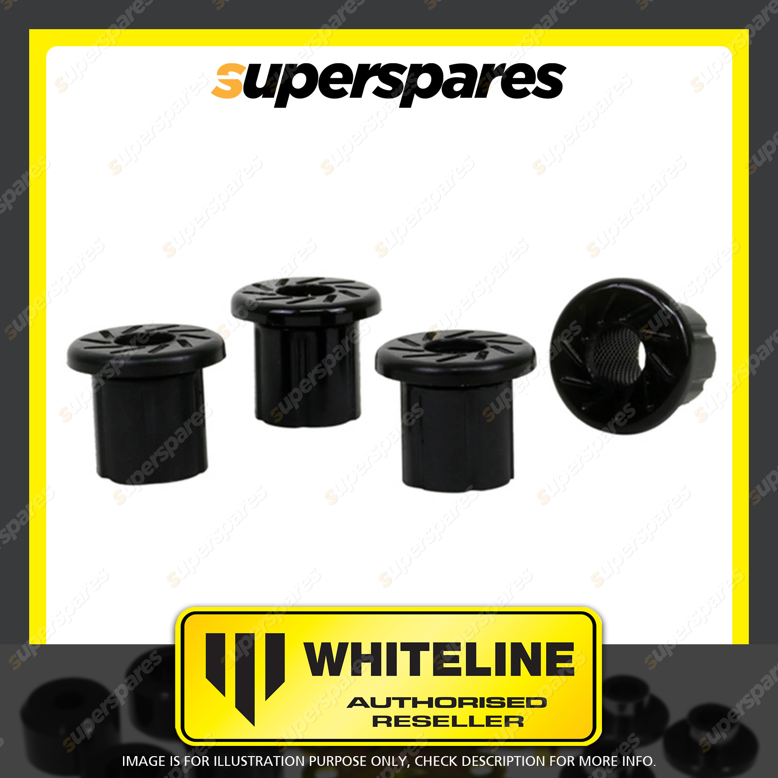 | Contents : Whiteline Rear Spring - eye Rear bushing Warranty : 3 Year / 60,000Kms Kit Contents : 4 Bushings, Install Guide, Grease |