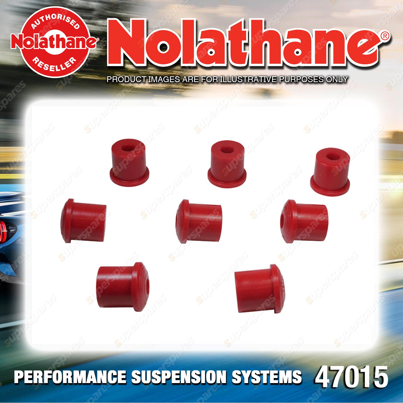 | Contents : Nolathane Rear Spring - eye rear and shackle bushing Warranty : 3 Year / 60,000Kms Kit Contents : 8 Bushings, Grease |