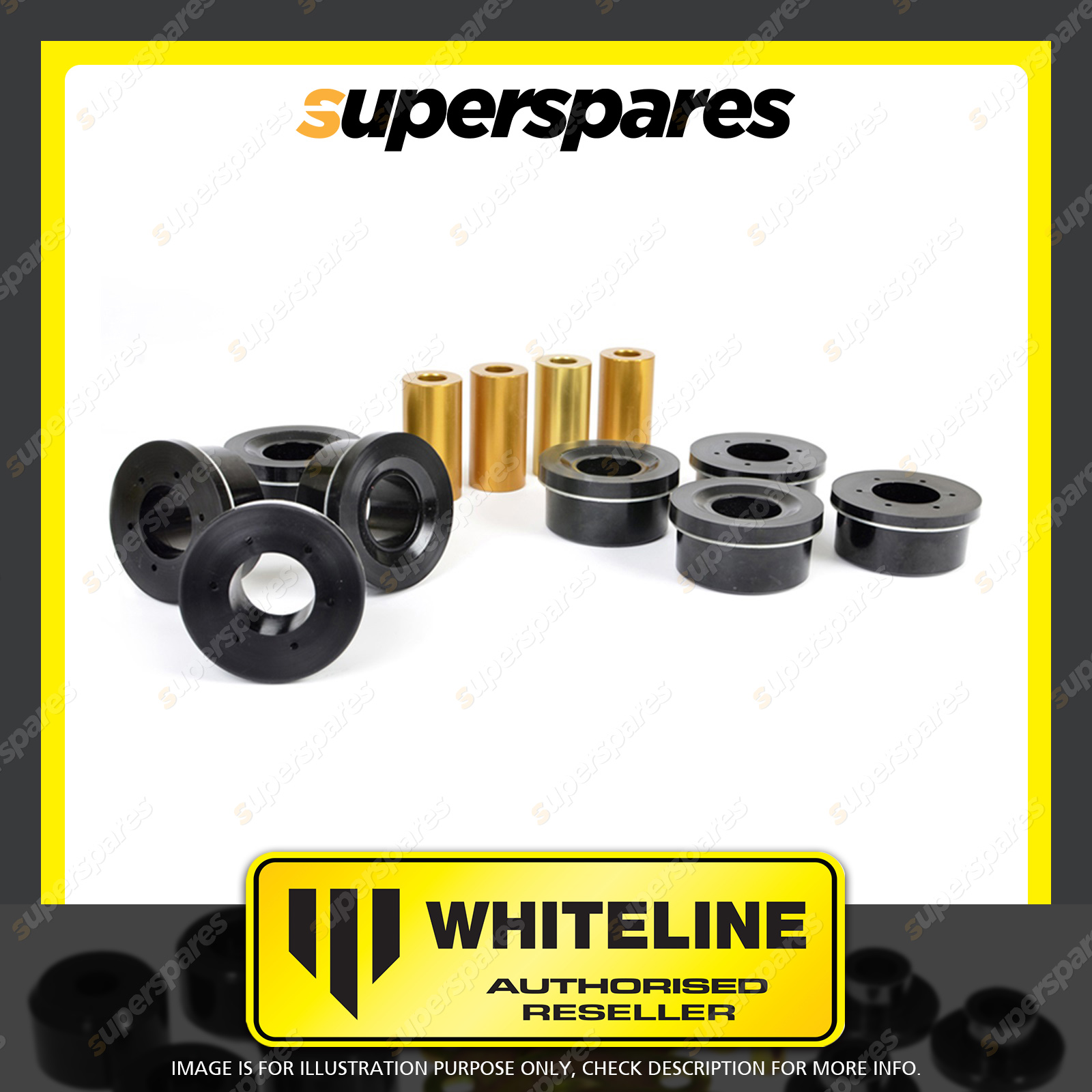 | Contents : Whiteline Rear Subframe - mount bushing Warranty : 3 Year / 60,000Kms Kit Contents : 8 Bushings, 4 Tubes, Install Guide, Grease |