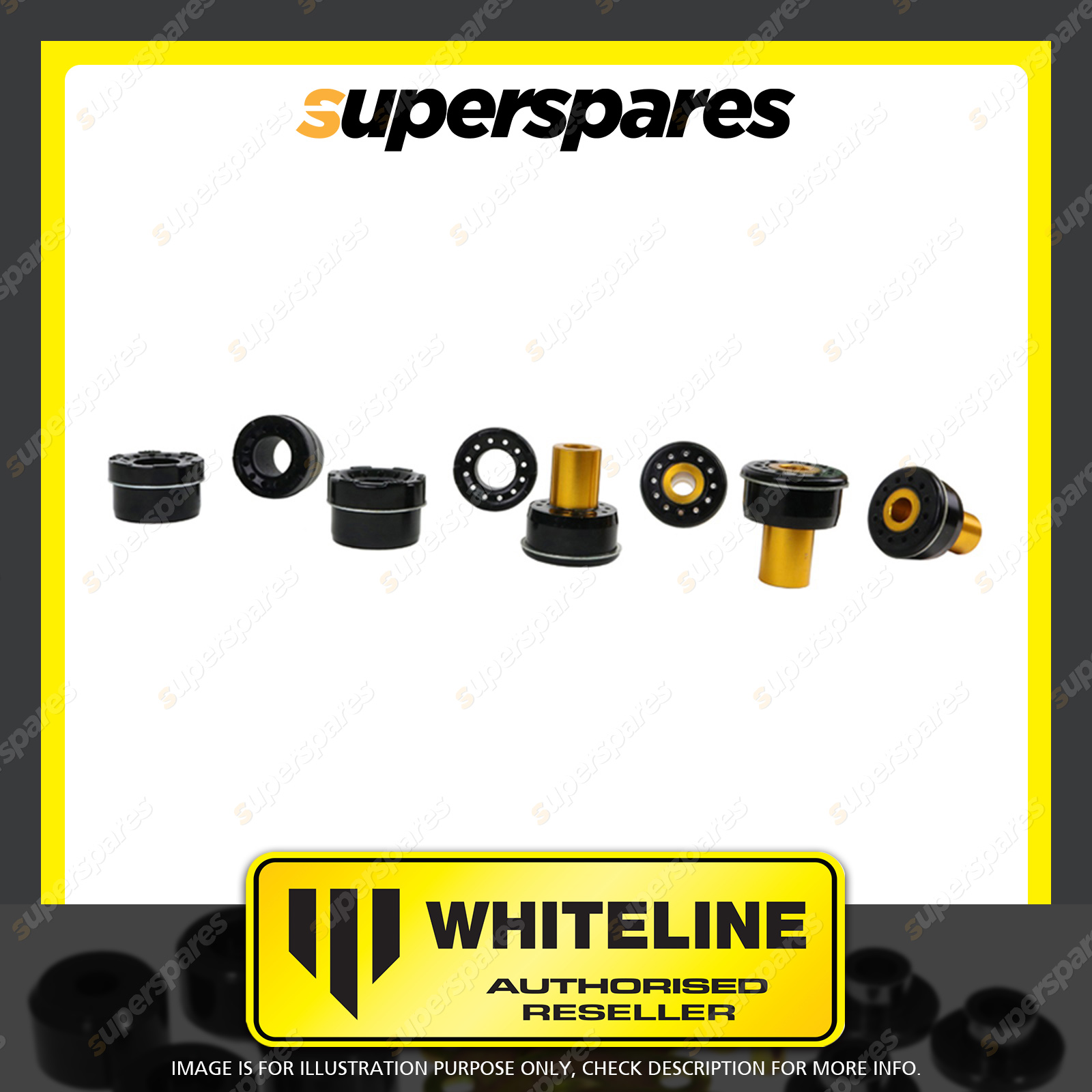 | Contents : Whiteline Rear Subframe - mount bushing Warranty : 3 Year / 60,000Kms Kit Contents : 8 Bushings, 4 Tubes, Install Guide, Grease |
