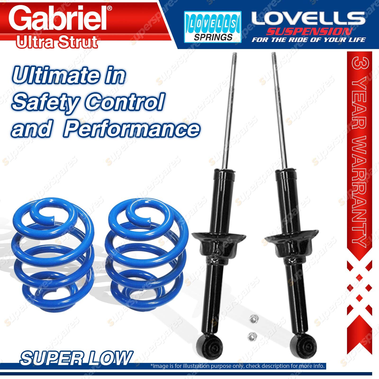 Contents: 2 x Gabriel Ultra Strut Shock Absorbers - Gas 2 x Super Low Lovells Springs Suit: Honda Concerto MA2 Hatchback 11/88-12/92 |