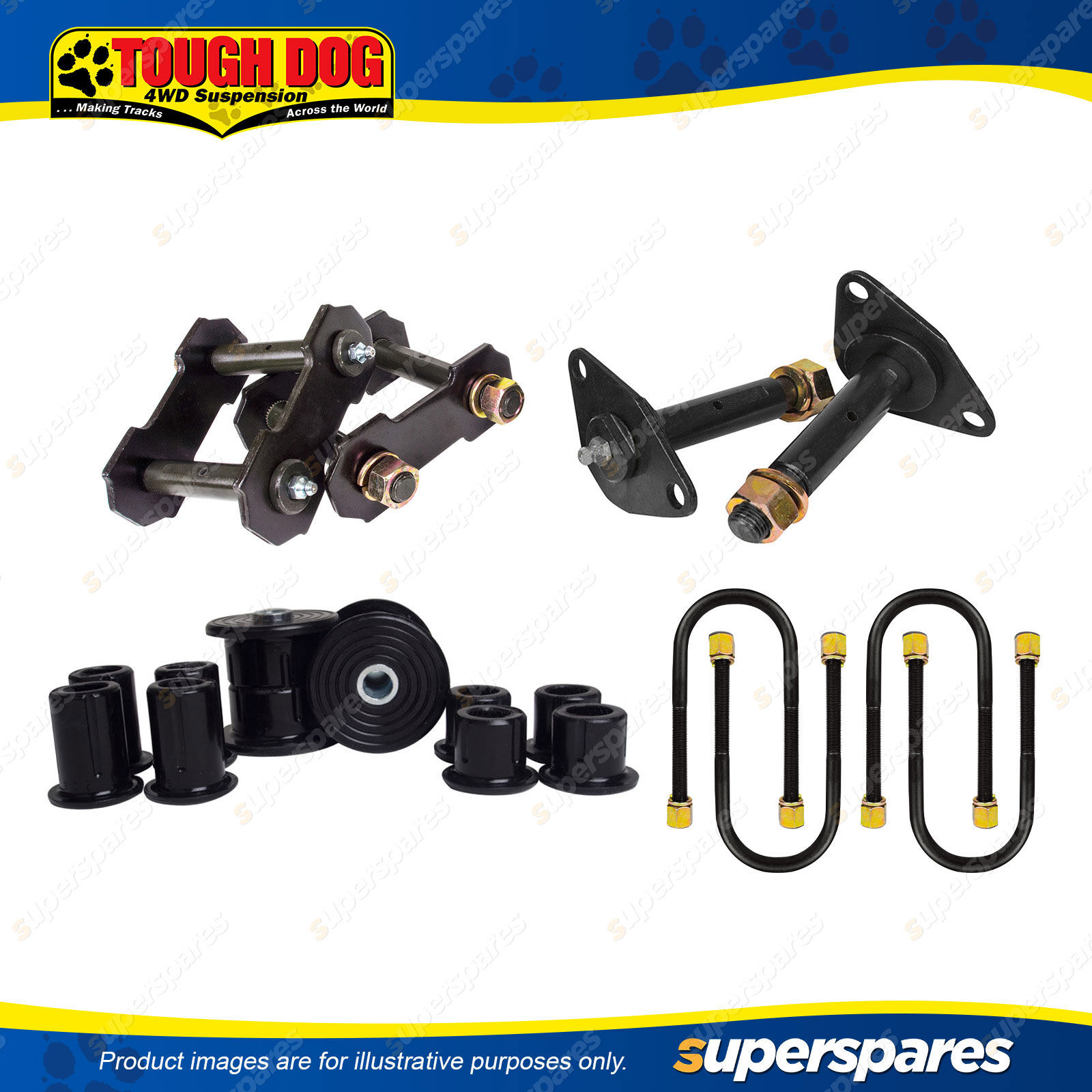 Contents: Rear Tough Dog Leaf Spring Fitment Kit Includes: Leaf Spring Bush, Leaf Spring Pin, Leaf Spring Shackles, Leaf Spring Ubolt Suit: Ford Ranger PJ & PK, 2.5L & 3.0L 12/2006-10/2011 |