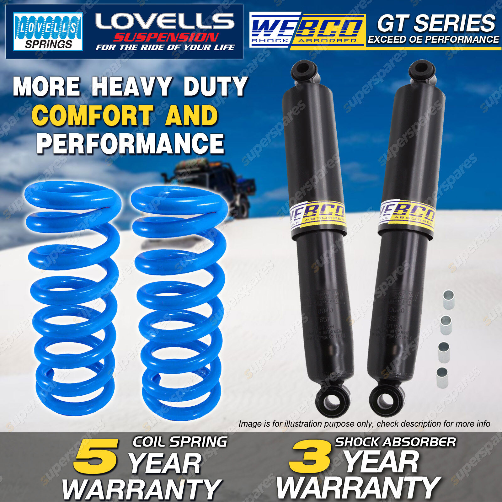 CONTENTS: 2 Pcs Rear Webco Heavy Duty Shock Absorbers 2 Pcs Rear Lovells Raised Coil Springs( 20-25mm Raised ) SUITS: MITSUBISHI L Series Van & Ute WA Starwagon 4 Cyl All 9/94 on (*please advise year model, so we can make sure send you the right parts) |