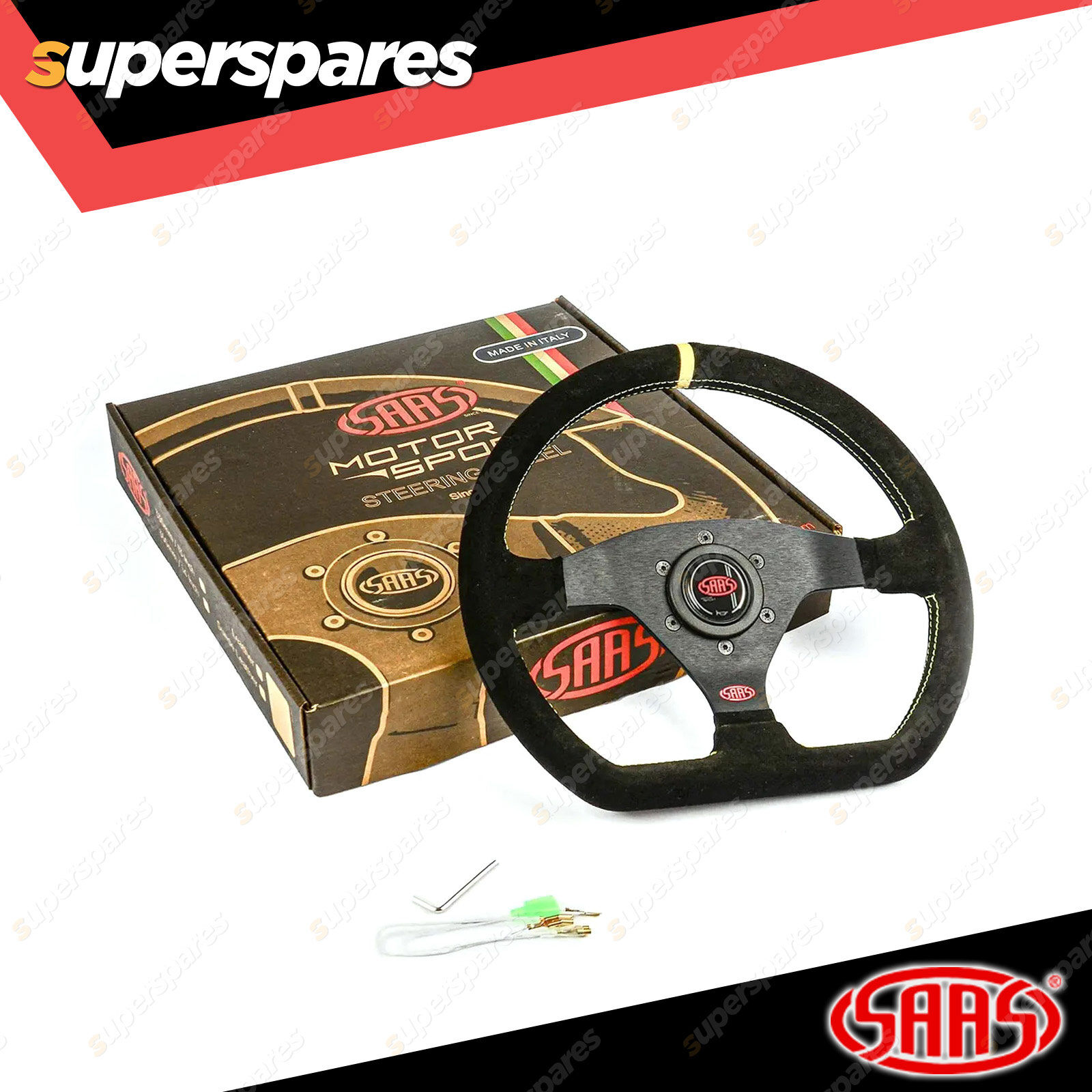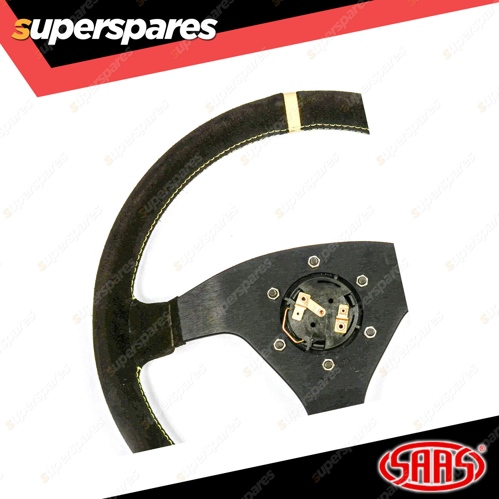 Our SAAS Italian made steering wheels are a masterpiece of design and craftsmanship. The Racing boasts a rounded grip and is exquisitely trimmed in Italian suede - this premium SAAS steering wheel evokes a high performance driving experience. The elegant hand stitching and a yellow centreline indicator add an element of classic design to your vehicle.