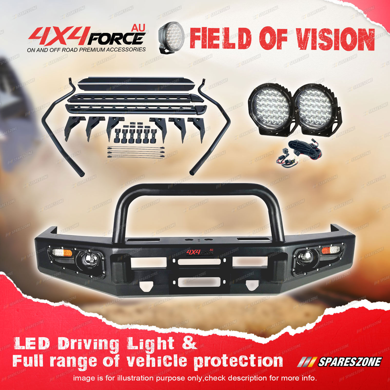 Bull Bar 4X4FORCE bull bars help protect your vehicle from animal strikes when driving on remote roads,and provide convenient locations to mount other 4x4 accessories such as winches,lights and aerials. 4X4FORCE bull bar is carefully crafted from premium grade materials and components to deliver the most comprehensive frontal protection and styling available. Each 4X4FORCE bull bar is specifically designed to complement the unique contours of individual vehicle models.This ensures the best possible fit,look and functionality for a particular vehicle.All 4X4FORCE bars are finished in a durable powder coat. |