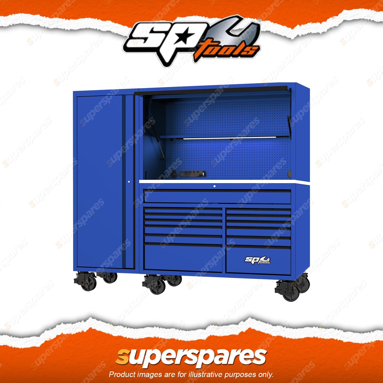 SIDE CABINET DIMENSIONS: (mm)1700w x 622d x 1954h MAGNETIC MOUNT SURGE PROTECTED POWER BOARD - 4 OUTLETS & 4 USB PORTSPOSITION YOUR POWER BOARD ANYWHERE ON YOUR TOOL KIT All USA Sumo Series power hutches and side cabinets include several electrical cable access points, strategically positioned to allow you to power or charge your tools and USB Powered devices as conveniently as possible. Each power board includes 4 individually switched surge protected power outlets and 4 USB ports and a magnetic holder unique to SP Tools, that allows users to position the power board on any steel part of the hutch or roll cab using four ultra strong magnetic backing plates. Warranty Policy SP Hand Tools - Lifetime Warranty SP Hand Tools are covered against manufacturing defects or faulty materials. This warranty does not cover overloading, abuse, misuse and/ or normal wear and tear. All SP Hand Tools are designed and manufactured for specific purposes and if not used for that intended purpose they will not be covered by the lifetime warranty. This lifetime warranty is in addition to what is covered in the Trade Practices Act (Aust), all state and territory laws and regulations and the Fair Trading Act (NZ). Tools that fail due to manufacturing defects or faults may be returned to a SP Hand Tool authorised dealer for repair or replacement at the sole discretion of Austech Industries Pty Ltd. Exemptions - All measuring equipment (12 month warranty), battery operated wrenches (24 month warranty), striking and cutting tools (6 month warranty), batteries & chargers (12 month warranty). SP Tool Storage - 12 Month Warranty SP Tool Boxes are covered against manufacturing defects or faulty materials. This warranty does not cover overloading, abuse, misuse and/or normal wear and tear. Tool Chests are designed for use in a workshop situation. The warranty does not cover the use of chests in a mobile situation with the exemption of our mobile solutions storage. This warranty is in addition to what is covered in the Trade Practices Act (Aust), all state and territory laws and regulations and the Fair Trading Act (NZ). All warranty claims must be returned to an authorised Austech dealer, freight pre-paid and packed to avoid transportation damage. If the claim is rejected, the product will be returned to the customer at their expense. |