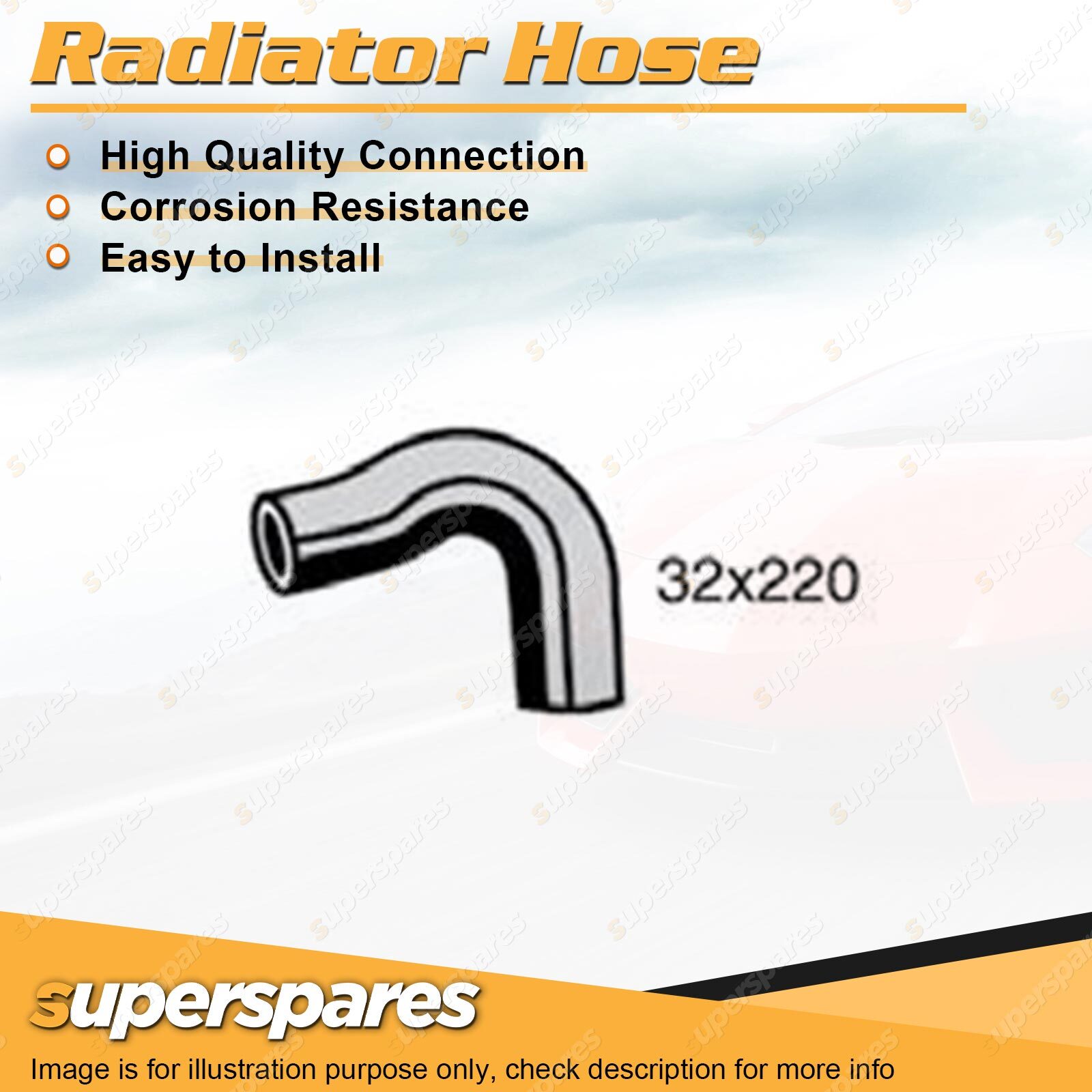 Content : 1 x Radiator Hose Brand : Superspares Position : Upper | Parameter : Length : 220mm Inside Diameter : 32mm |
