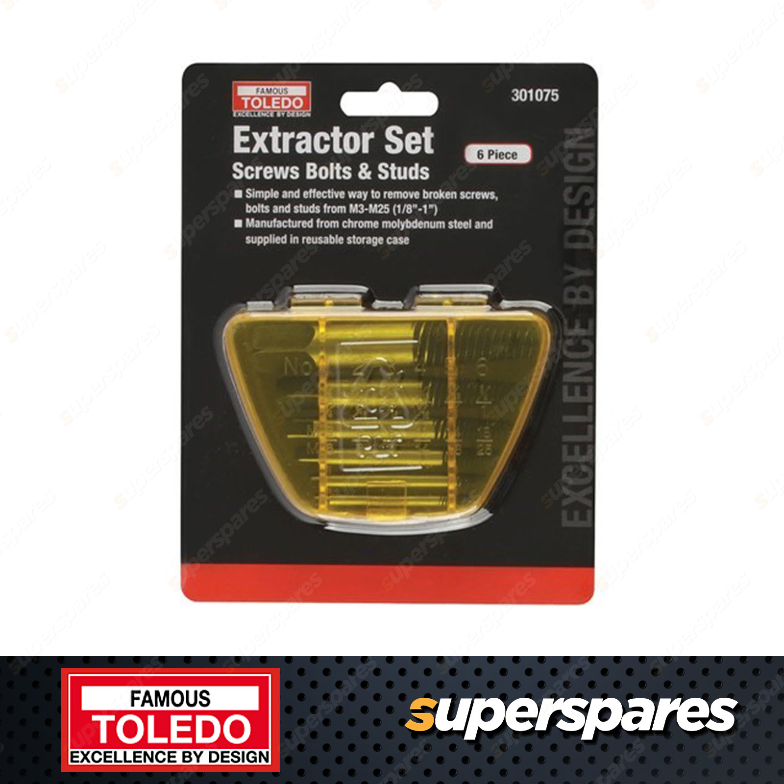 Toledo Screw Extractor 6pc Set 3 - 25mm Left Hand Thread Design For removal of broken screws, bolts or studs Utilises left hand thread design to lock and remove broken component Ideal for automotive, industrial and hardware applications 6 piece set suitable for use on screw or bolts from 3 25mm Manufactured from heat treated high grade steel for superior strength and durability