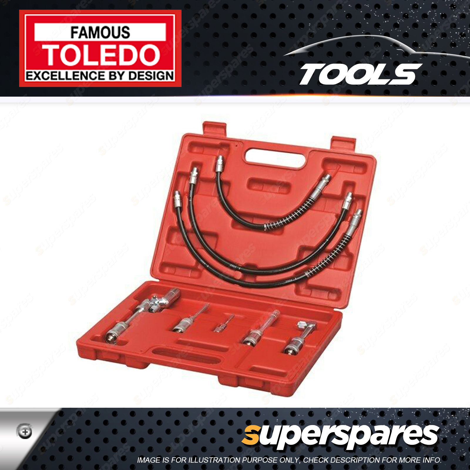 Greasing Accessory Kit - 8 Pc Complete 8 piece kit of adaptors for all lubrication servicing ITEM CONTENTS Code Name Qty |