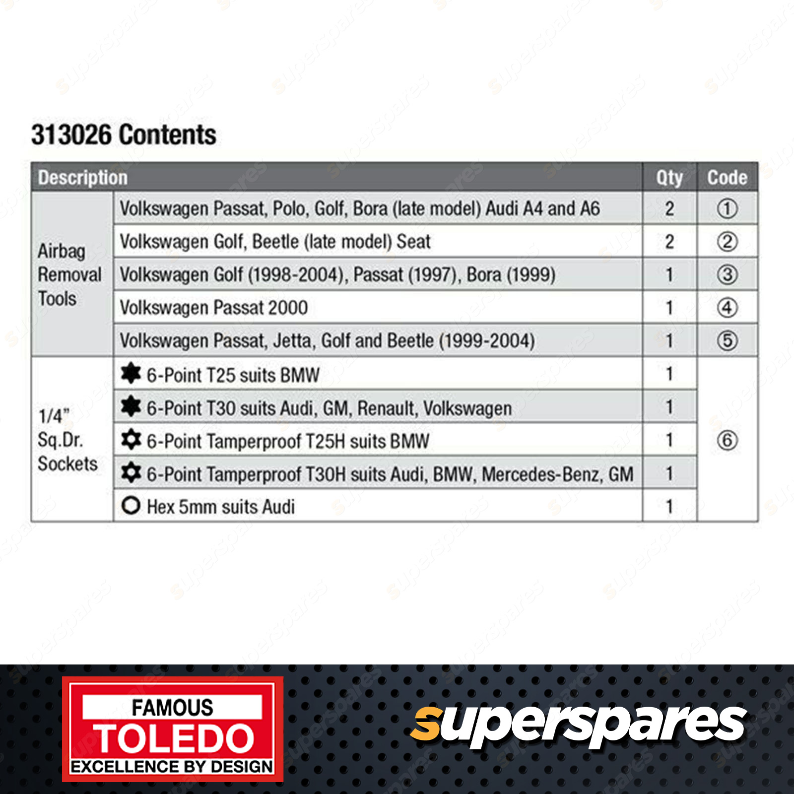 Toledo Air Bag Removal Kit Name Qty For safe efficient and damage free removal of steering wheel airbags |