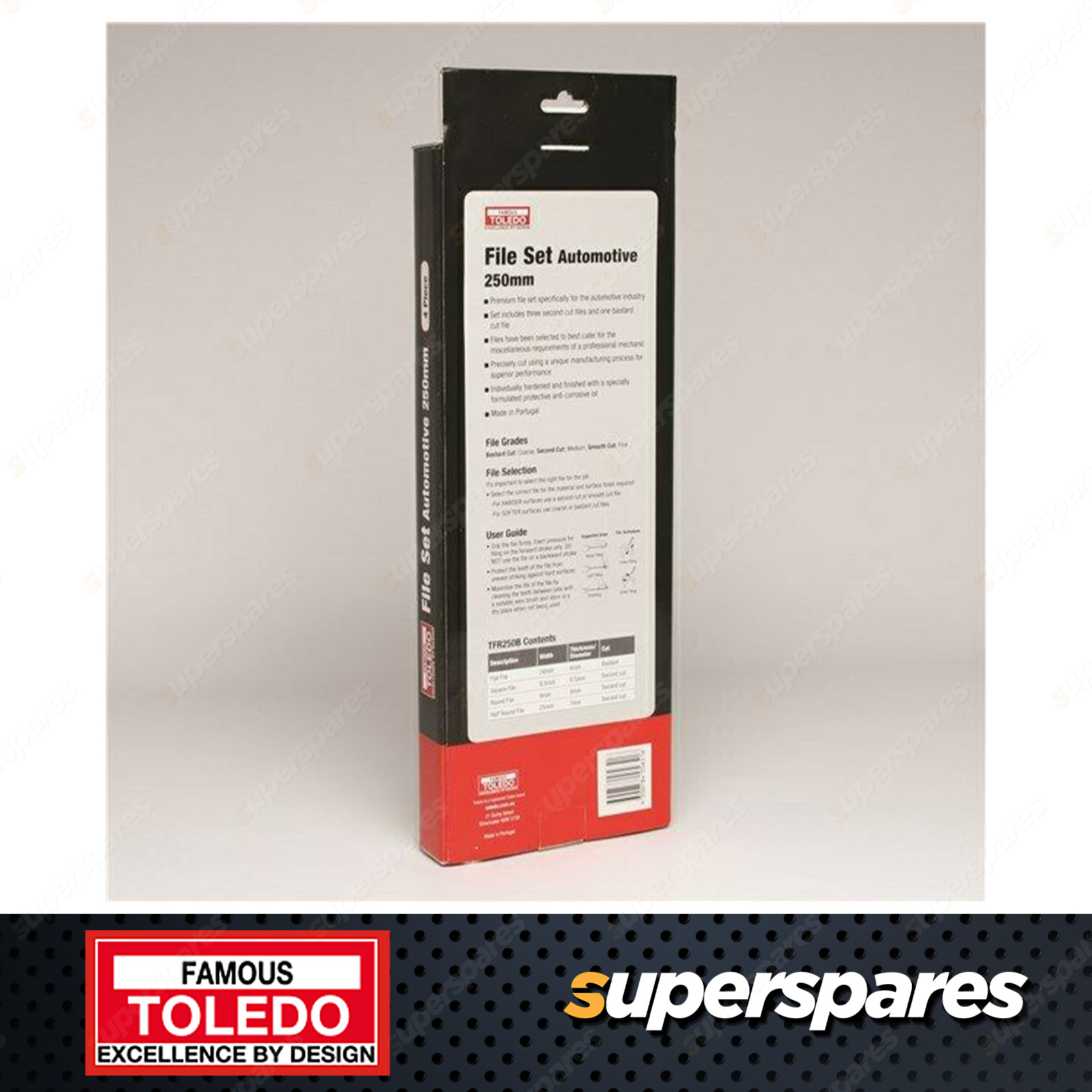 Toledo Automotive File 4pc Set 2nd Cut Round, Half Round, Square and Bastard Cut Specially created file set to cater for automotive use Includes 2nd cut round, half round, square and bastard cut flat Premium European made file set specifically for the automotive industry Set includes three second cut files and one bastard cut flat file Contents have been chosen to best cater for the miscellaneous requirements of a professional mechanic Precisely cut using state of the art manufacturing equipment in order to give the best working file Individually hardened and finished with a specially formulated protective anticorrosive oil Specially created file set to cater for automotive use Includes 2nd cut round, half round, square and bastard cut flat Premium European made file set specifically for the automotive industry Set includes three second cut files and one bastard cut flat file Contents have been chosen to best cater for the miscellaneous requirements of a professional mechanic Precisely cut using state of the art manufacturing equipment in order to give the best working file Individually hardened and finished with a specially formulated protective anticorrosive oil |