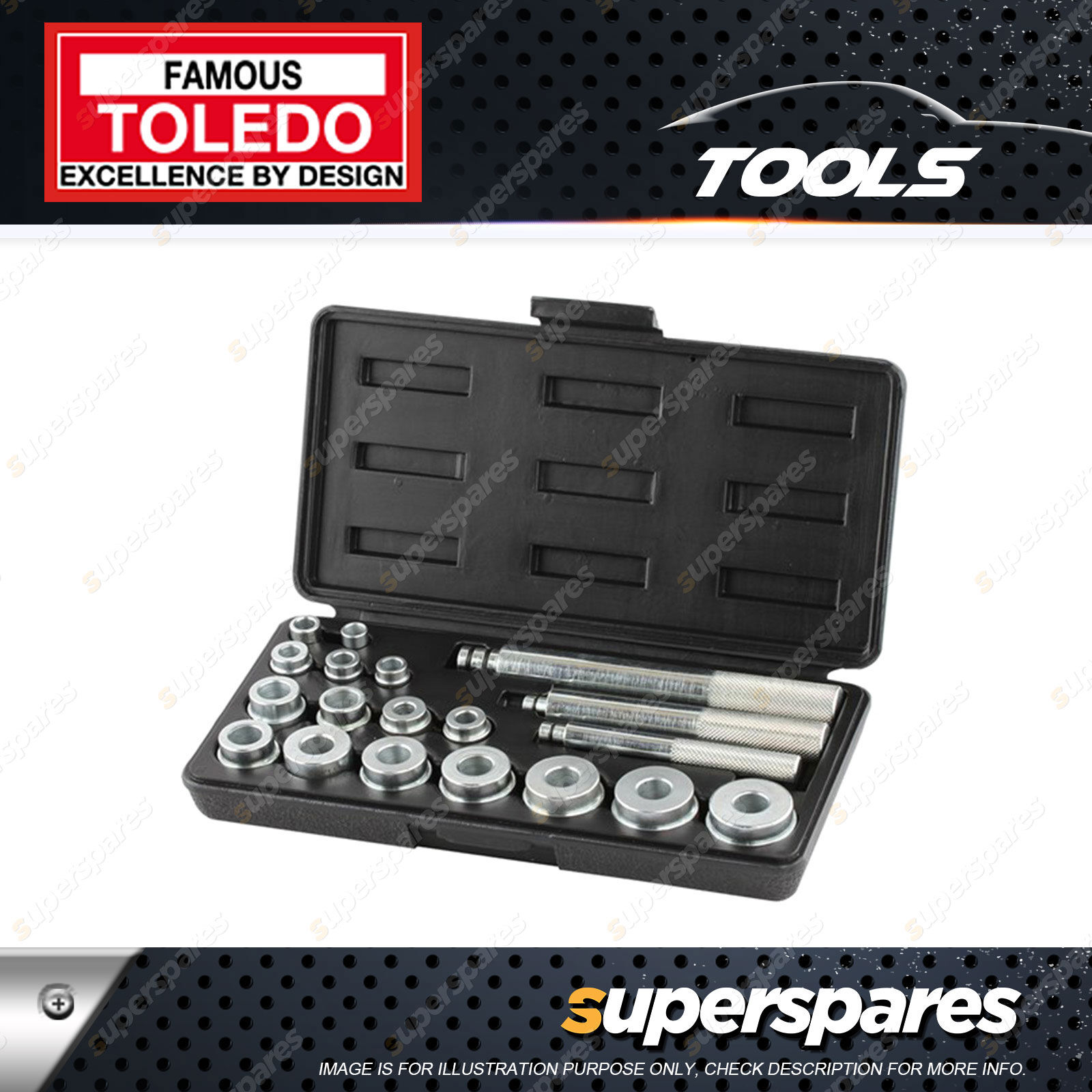 Contents: Toledo Bearing & Seal Installer Kit 20 pcs - 3 Drivers & 16 Adaptors 9.5mm-35mm
