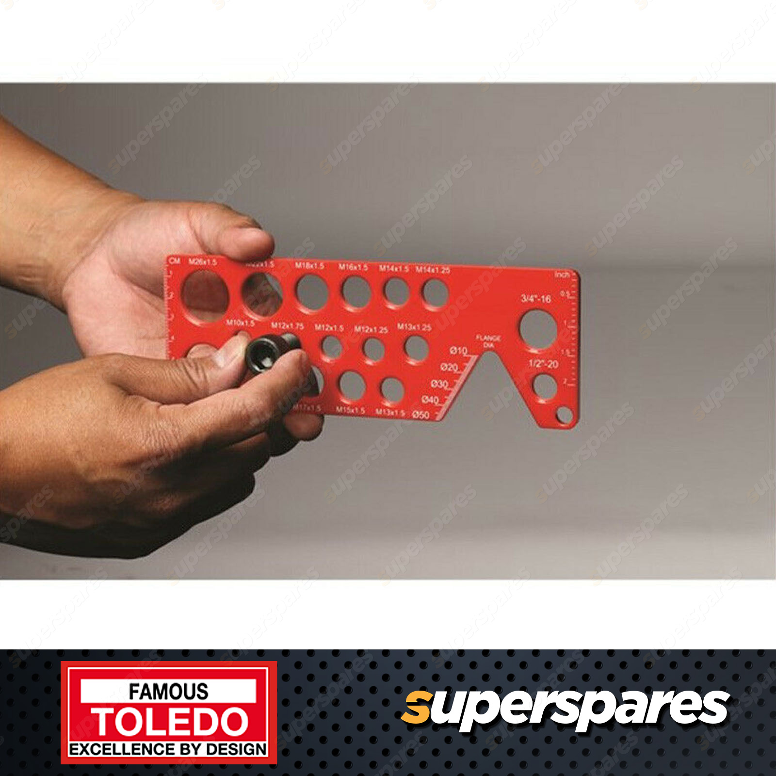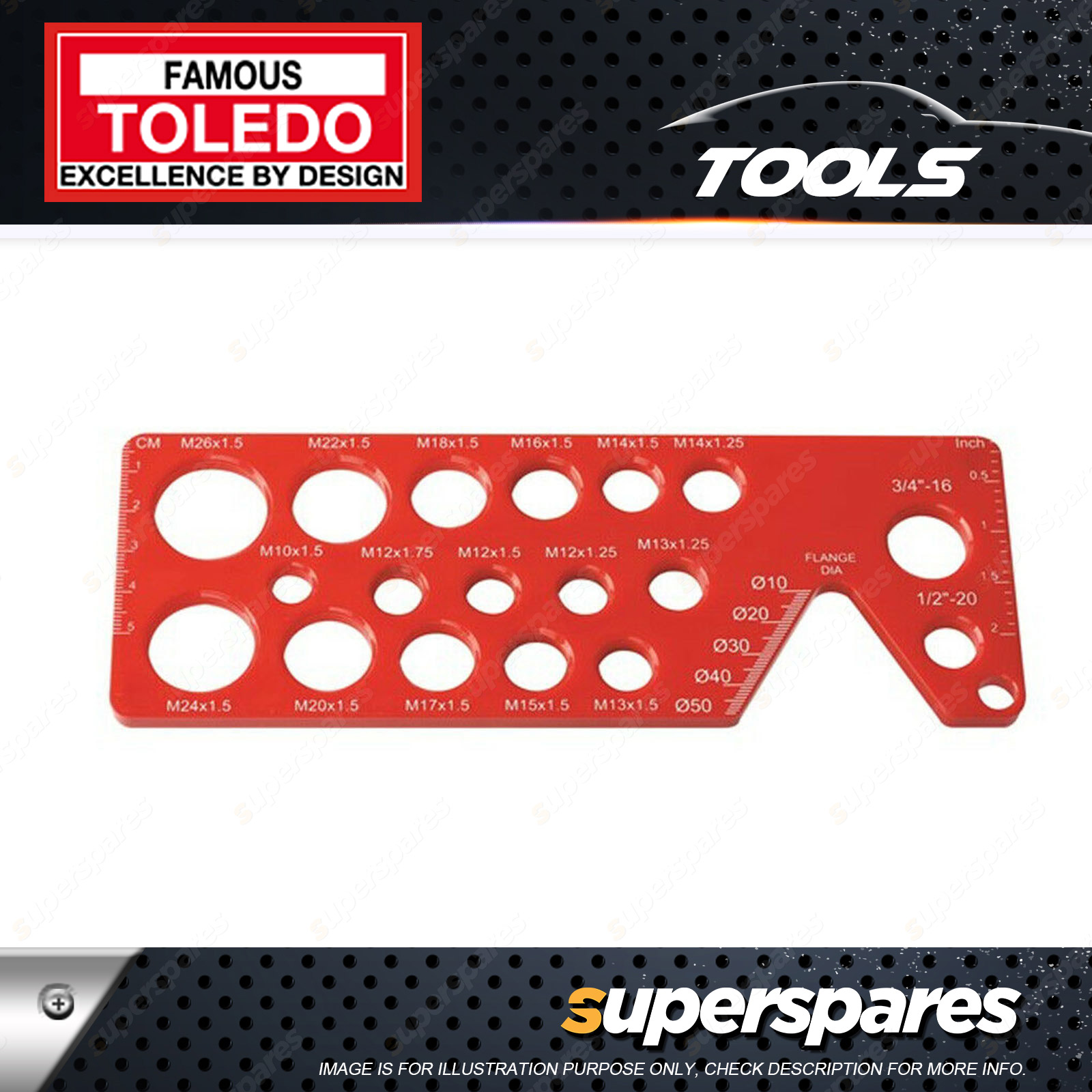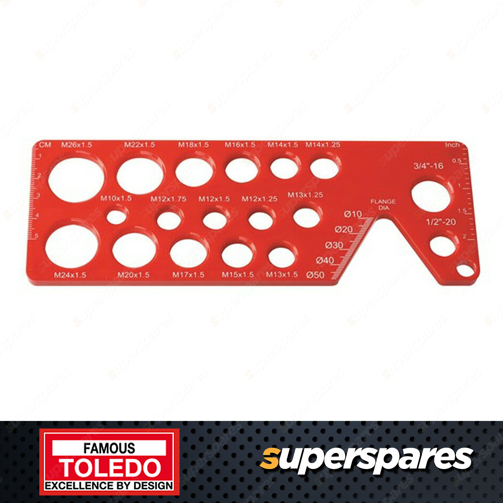 Toledo Bolt Pitch Gauge Metric 18 Different Pitches and Thread Sizes Quickly and easily identify bolt size and pitch Sizes - Metric: M10x1.5, M12x1.75, M12x1.5, M12x1.25, M13x1.25, M13x1.5, M14x1.25, M14x1.5, M15x1.5, M16x1.5, M17x1.5, M18x1.5, M20x1.5, M22x1.5, M24x1.5, M26x1.5 |