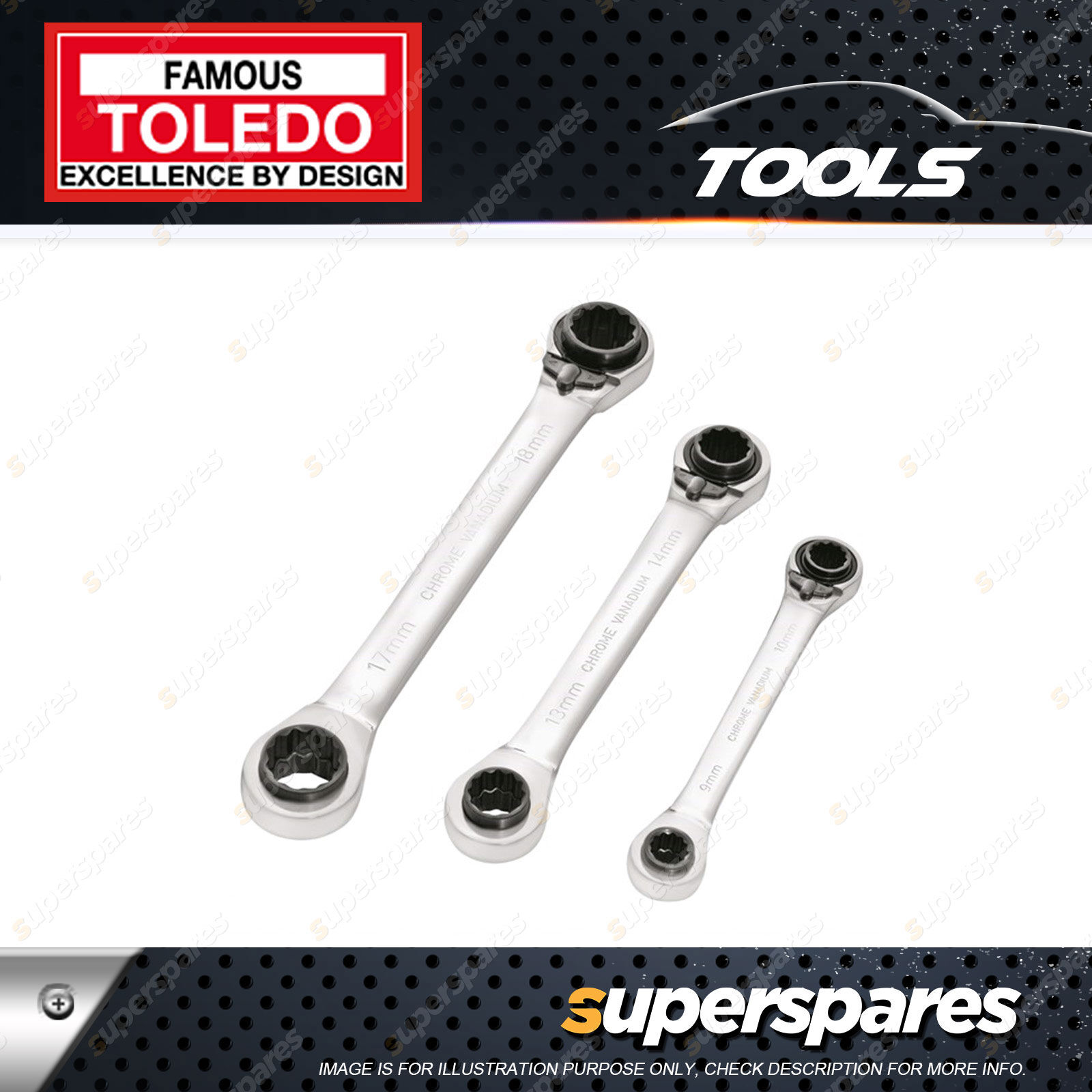 Contents: Toledo Dual Head Ratchet Wrench Set 3 pcs - Metric 8-19mm Four in One