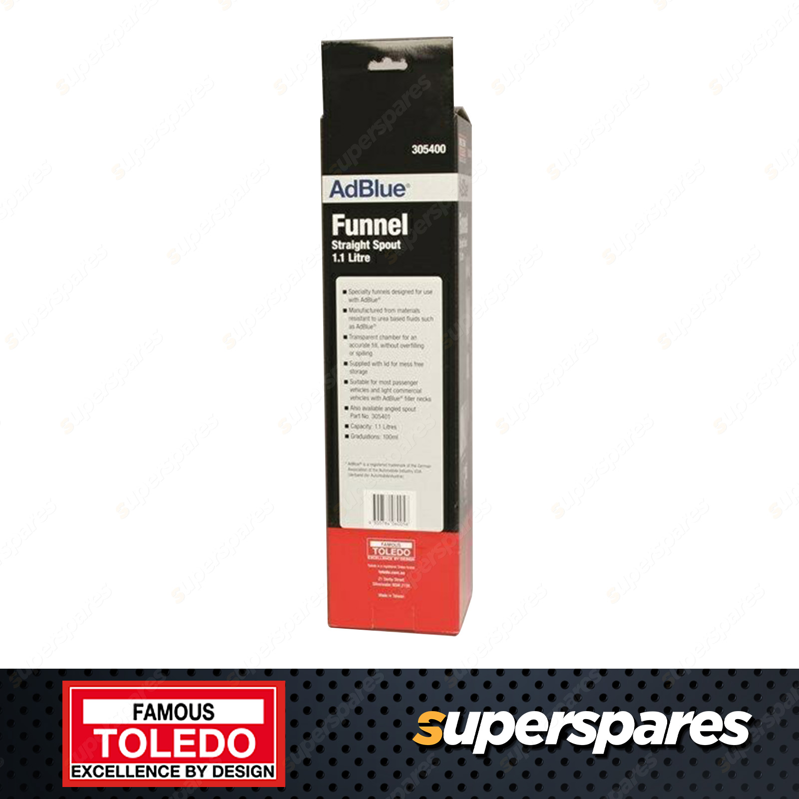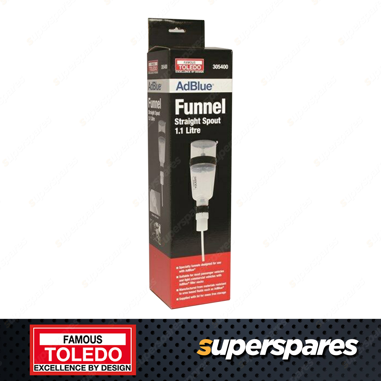 Toledo Funnel For AdBlue - Straight 1.1L Specialty funnels designed for use with AdBlue Manufactured from materials resistant to urea based fluids Transparent chamber for an accurate fill, without overfilling or spilling Supplied with lid for mess and contaminant free storage Available in straight or angled spout, suitable for most passenger vehicles and light commercial vehicles with AdBlue filler necks Note: It is recommended to thoroughly clean funnel after each use as AdBlue will crystallise when dry Straight neck and angled neck units are not compatible and it is advised against interchanging necks Specialty funnels designed for use with AdBlue Manufactured from materials resistant to urea based fluids Transparent chamber for an accurate fill, without overfilling or spilling Supplied with lid for mess and contaminant free storage Available in straight or angled spout, suitable for most passenger vehicles and light commercial vehicles with AdBlue filler necks Note: It is recommended to thoroughly clean funnel after each use as AdBlue will crystallise when dry Straight neck and angled neck units are not compatible and it is advised against interchanging necks |