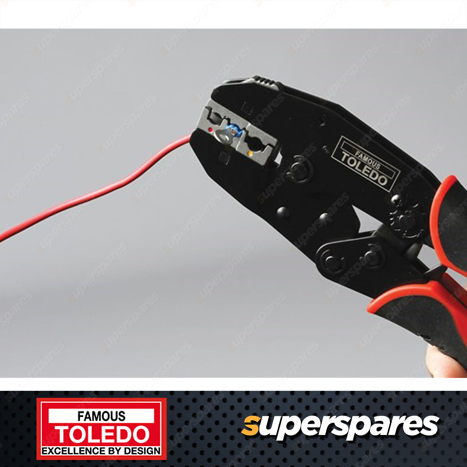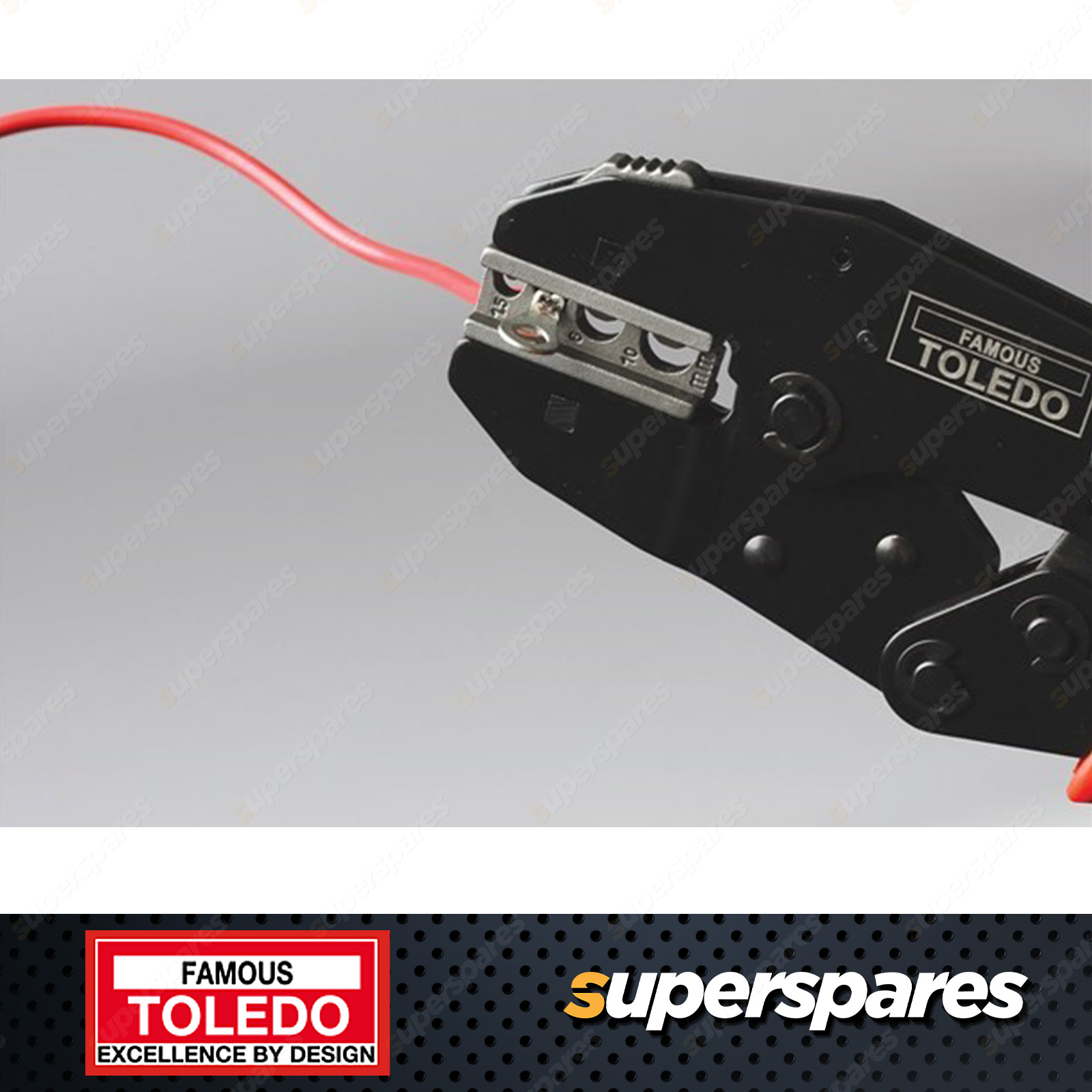 Toledo Multi-Head Crimping Plier Kit Ratcheting 7 x Dies 1 x Crimper Die A - Insulated terminals 22 18/16 14/12 10 (AWG) , 0.5 1/1.5 2.5/4 6 (mm2) Ratchet crimping tool design with quick release, for high leverage superior terminal crimp |