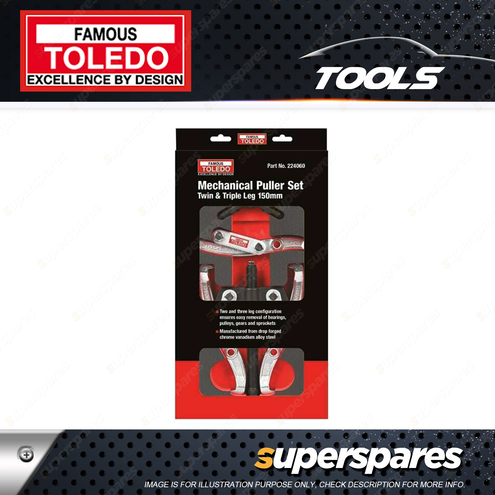 Toledo Twin & Triple Leg Mechanical Puller Set - 75mm Interchangeable twin and triple heads allow for an infinite number of internal and external pulling applications ITEM CONTENTS Code Name Qty |
