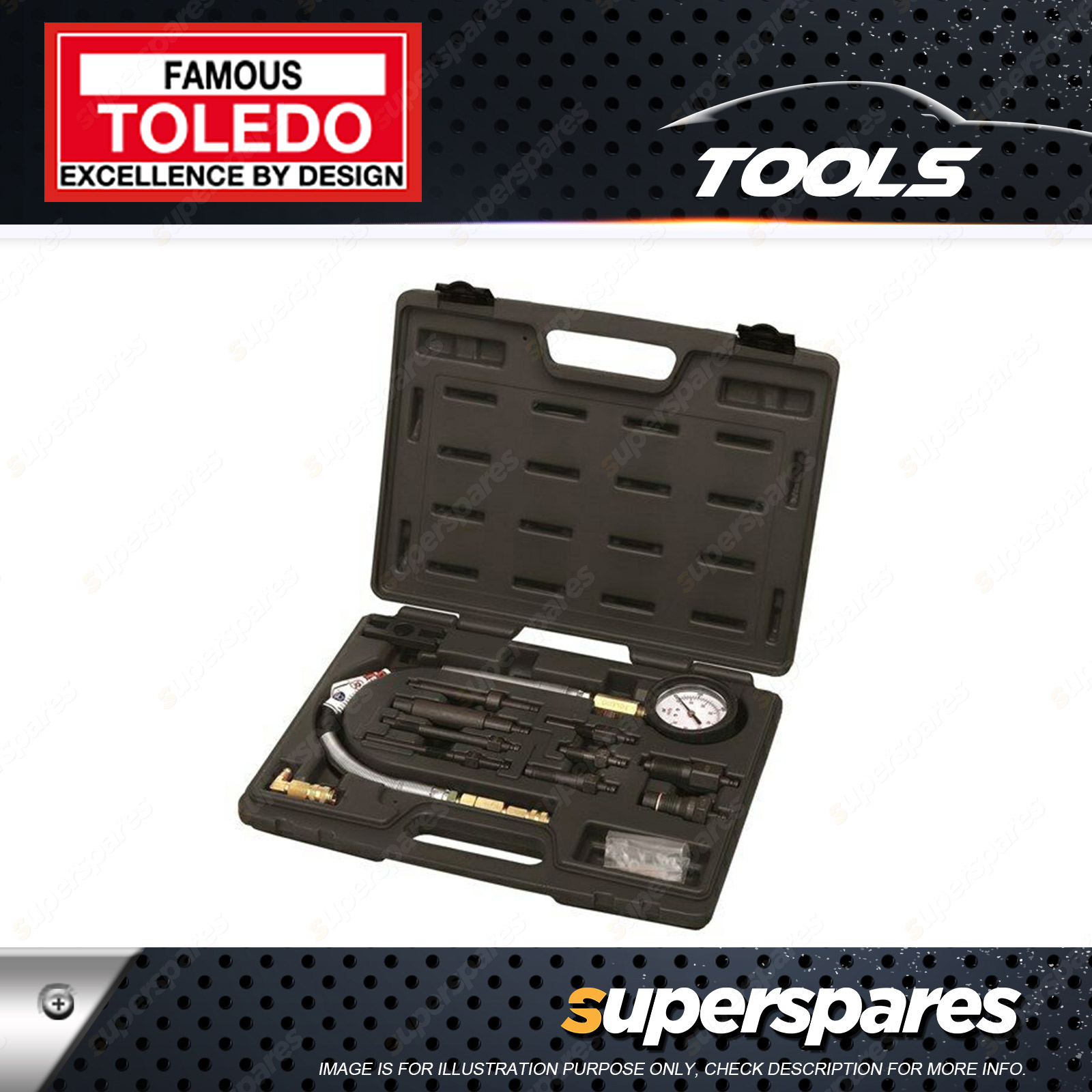 Toledo Compression Tester Kit - Diesel Passenger Vehicles For diagnosis of compression related problems on diesel engines ITEM CONTENTS Code Name Qty |