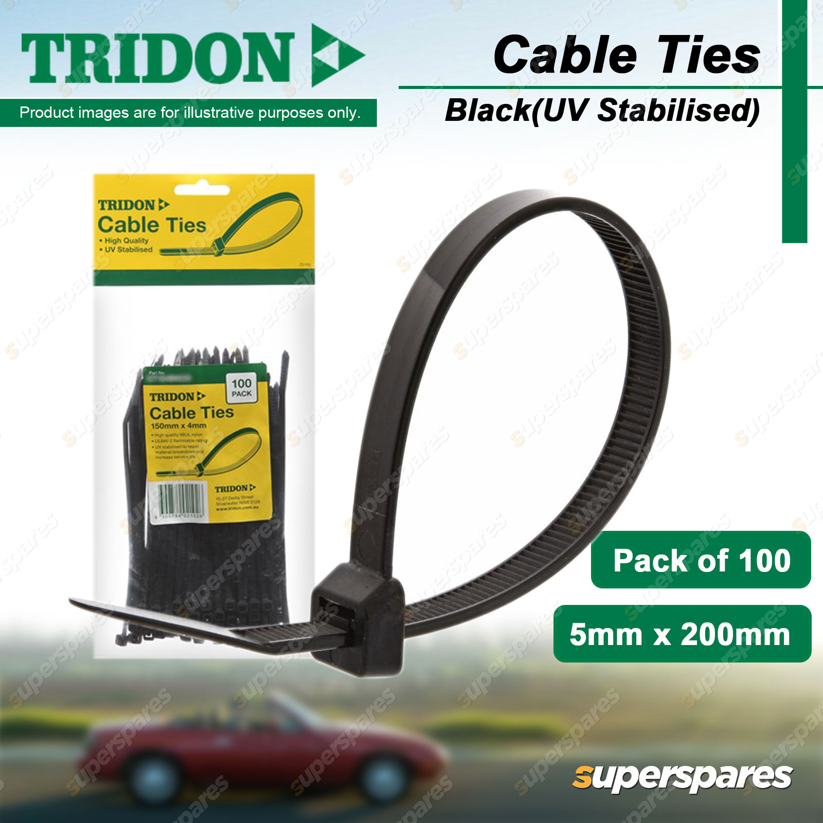 Content : Tridon Cable Ties - Black(UV Stabilised) Size : 5mm x 200mm Quantity : 100 |