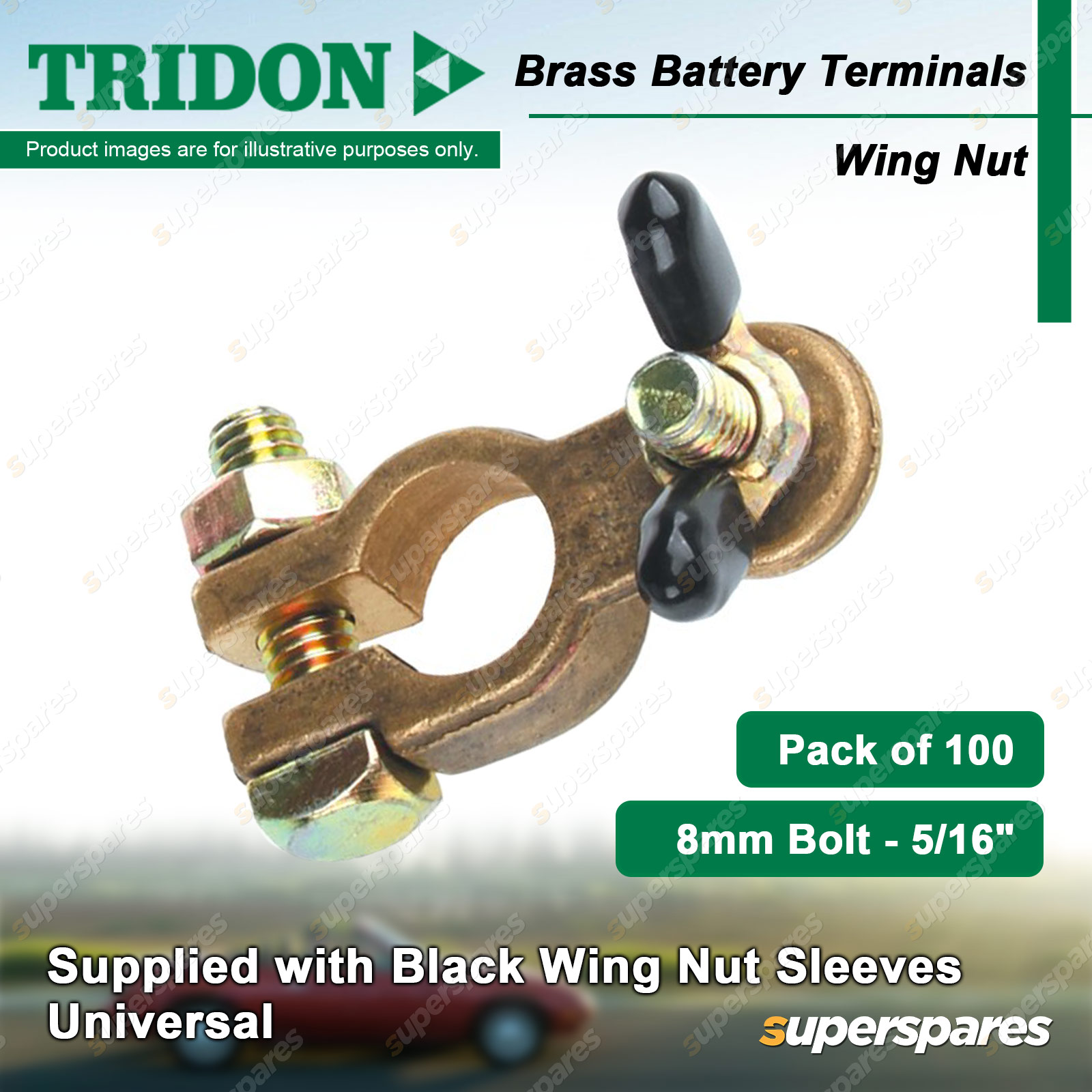 Content : Tridon Battery Terminals Finish : Brass Terminal Type : Wing Nut Post Type : Universal Quantity : 100 Packaging : Boxed Note : Supplied with Black Wing Nut Sleeves |