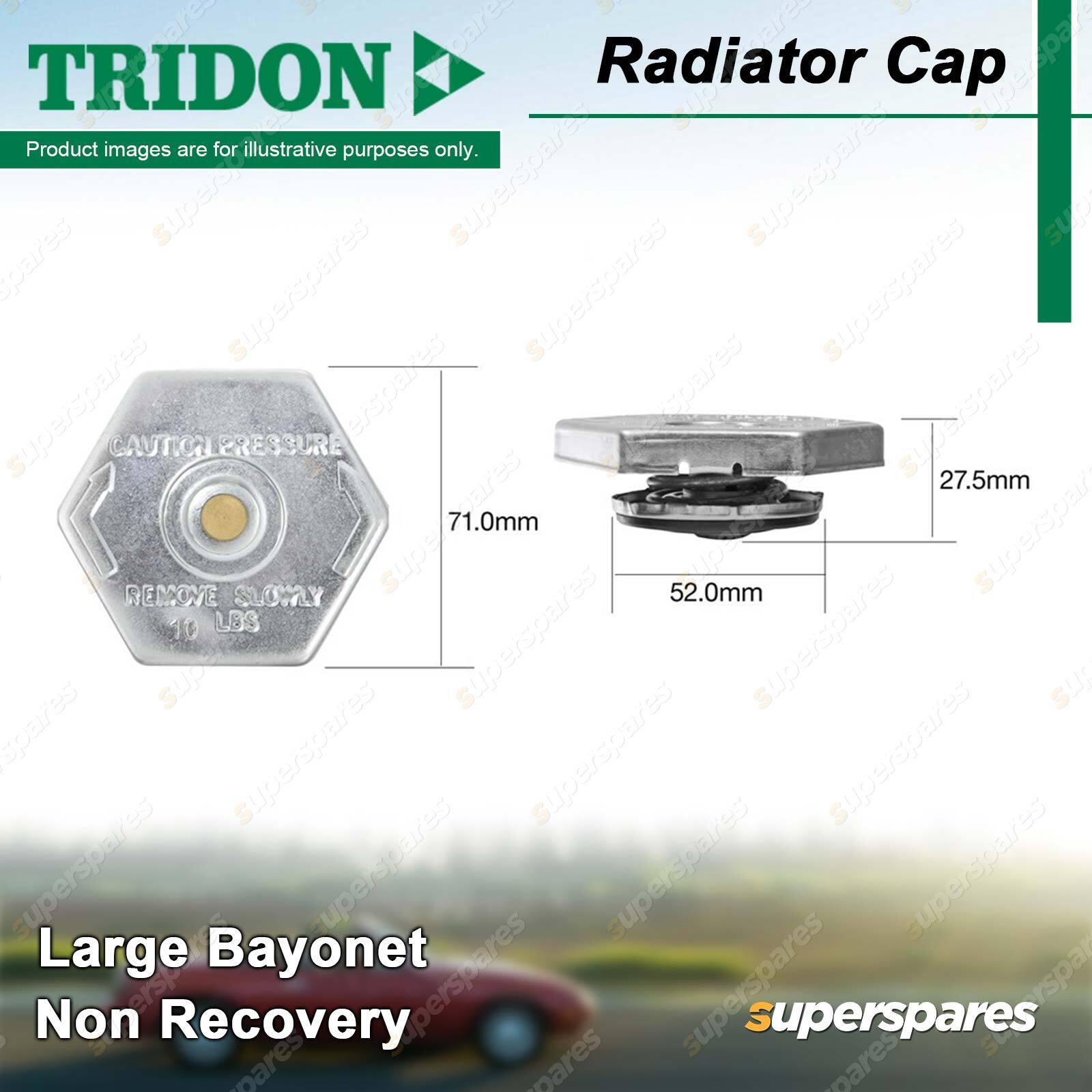 Content : 1 x Tridon Radiator Cap System : Non Recovery Cap Style : Metal Pressure : 7 PSI/50 kPa Connection Type : Large Bayonet |