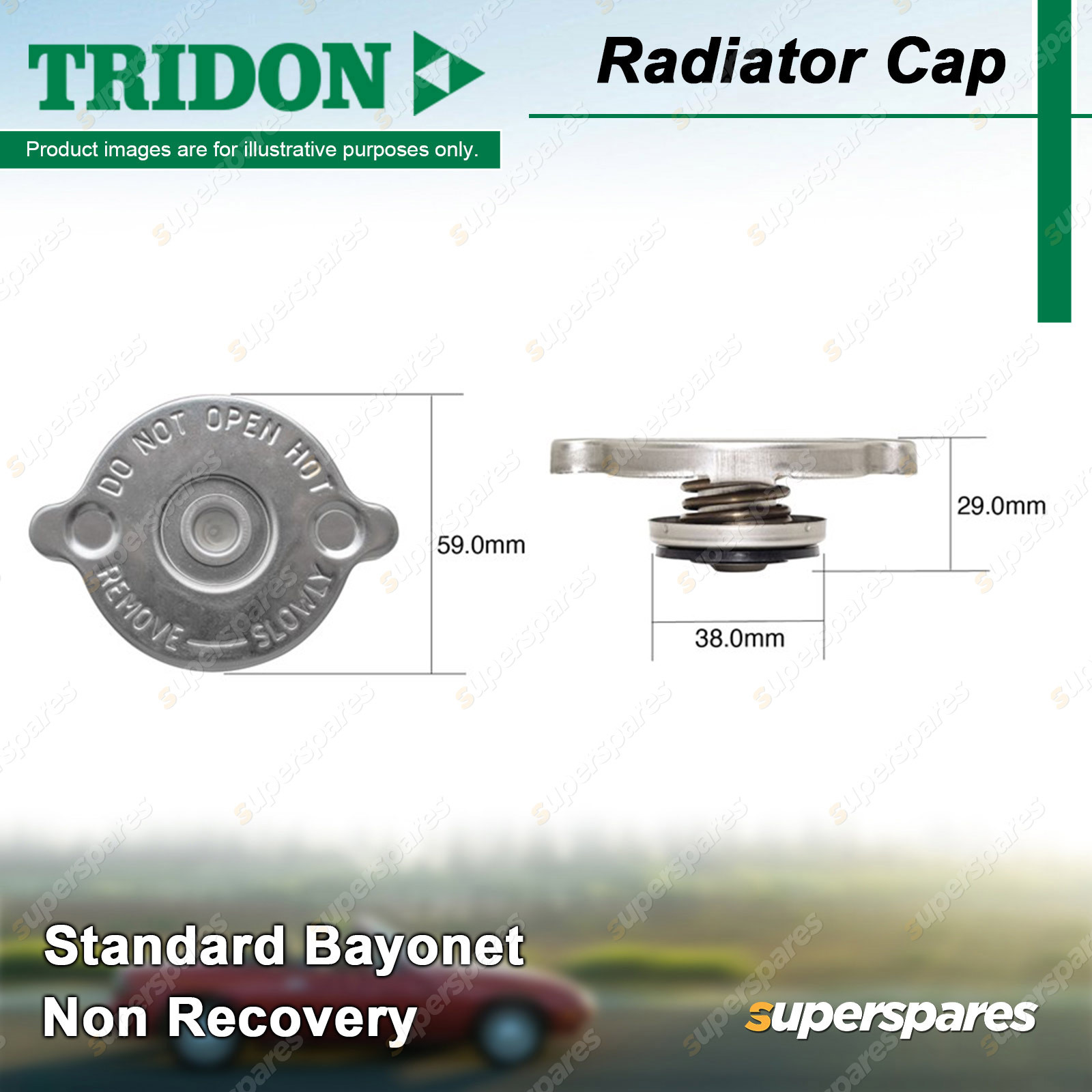 Content : 1 x Tridon Radiator Cap System : Non Recovery Cap Style : Metal Pressure : 4 PSI/30 kPa Connection Type : Standard Bayonet | Specifics: Cap Width : 59.0mm Cap Height : 29.0mm Neck Diameter : 38.0mm |
