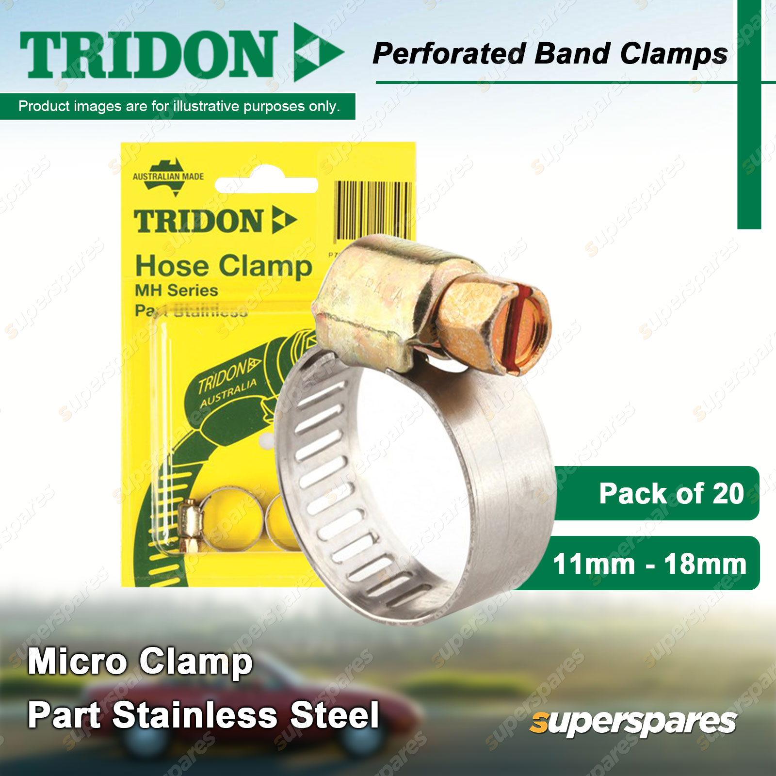 Content : Tridon Perforated Band Clamps - Part Stainless Steel Qty : 2 Per Card x 10 Card Series : MH Series (Micro Clamp) Packaging : Carded Clamp |