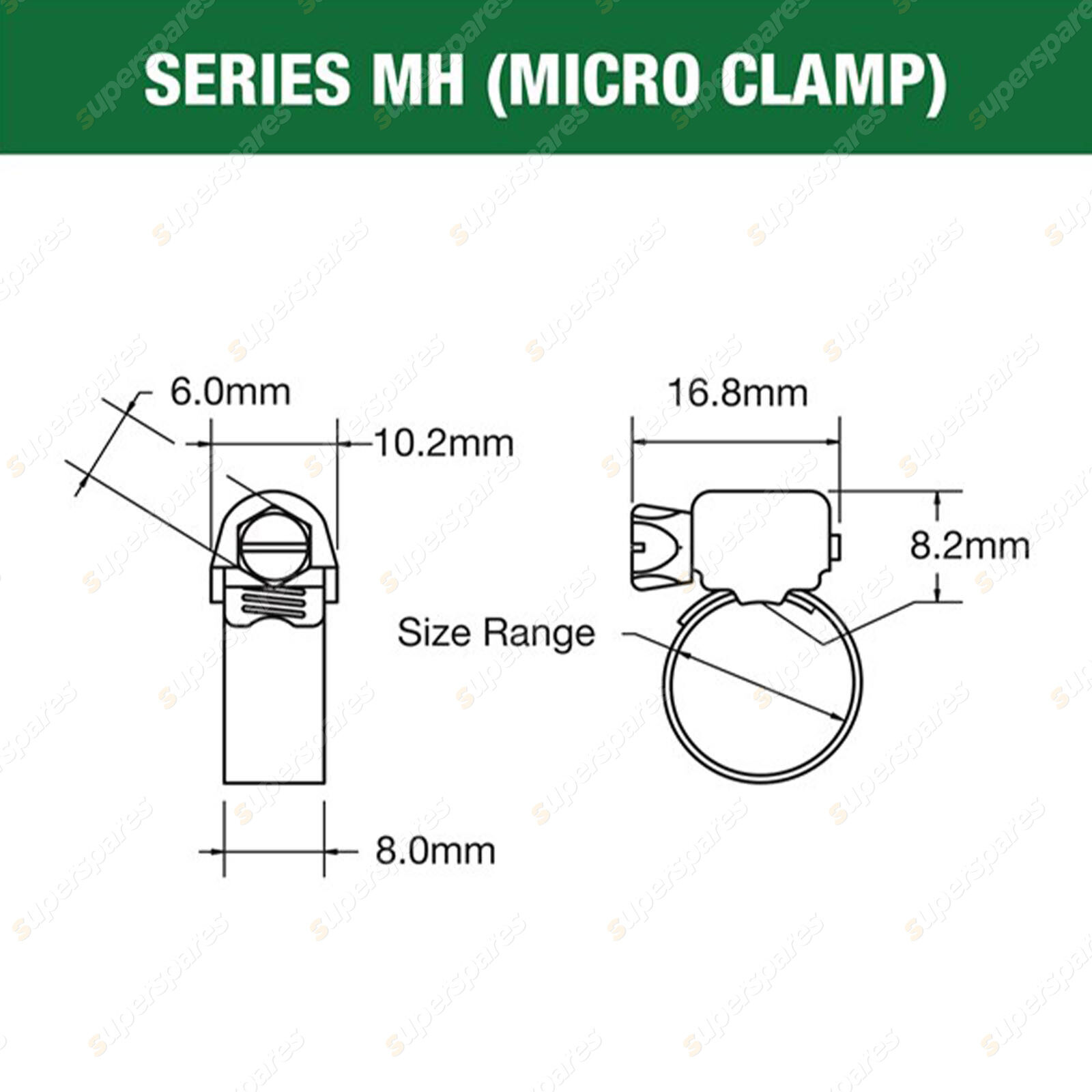 Content : Tridon Perforated Band Clamps - Part Stainless Steel Total Pack Qty : 50 Series : MH Series (Micro Clamp) Packaging : Boxed Clamp | Specifics Size : 59mm - 76mm Band : 301 Stainless Steel Housing : Mild Steel Screw : Carbon Steel Zinc Plated (Hex Head) |